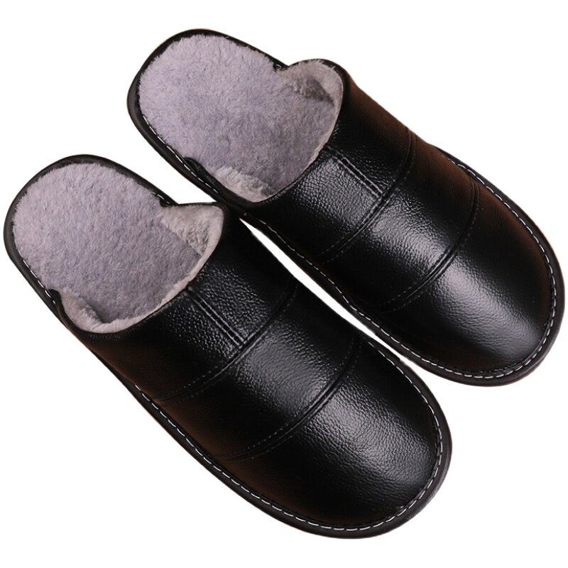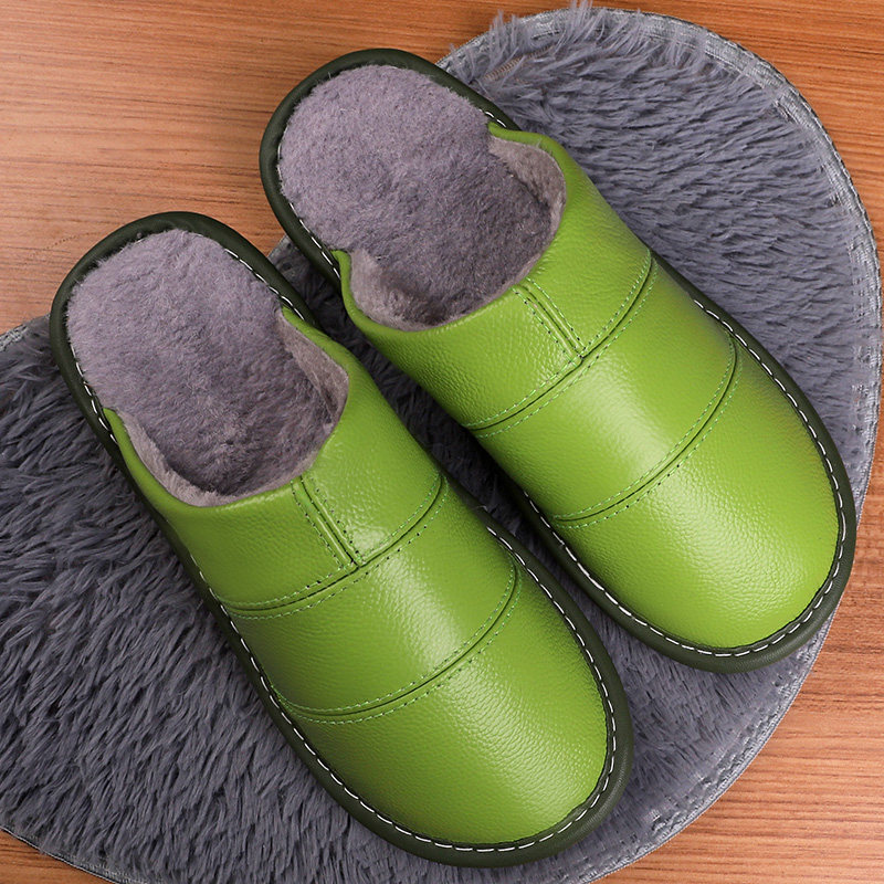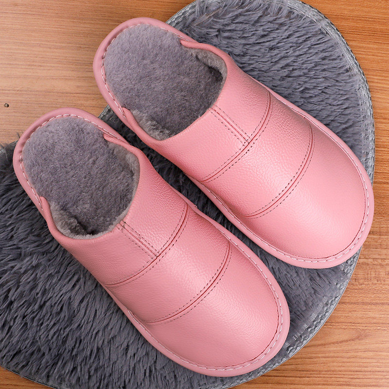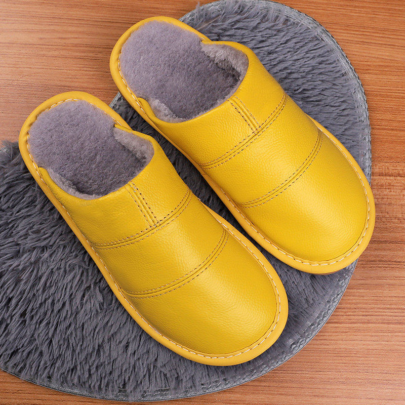 Cotton slippers female winter couples household with anti-slippery thick bottom waterproof warm leather wool plush slippers