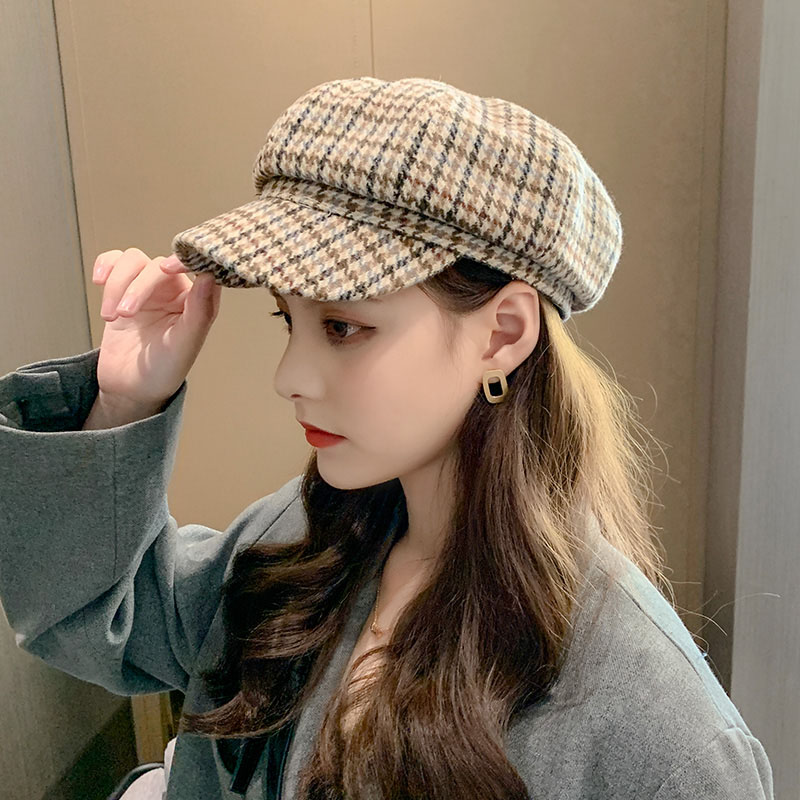 Houndstooth plaid beret female winter fashion wild Korean version 2022 new British retro spring and autumn octagonal hat
