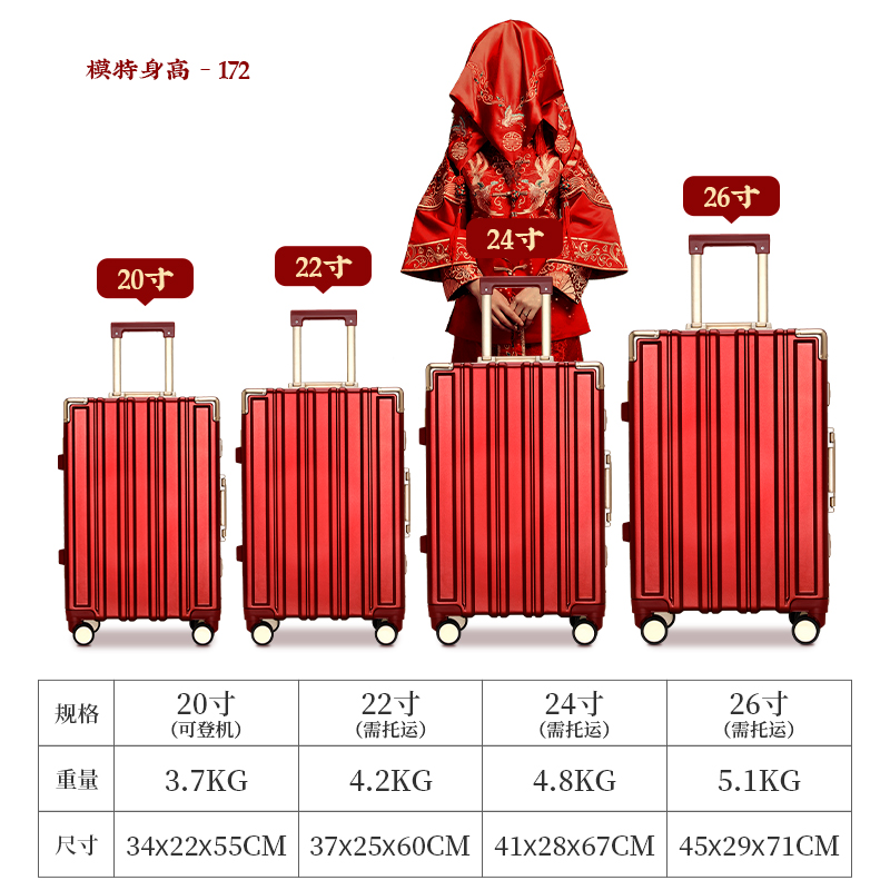 20 inch (small wedding climbing case) 22 inch (universal wedding larch box) 24 inch (long wedding suitcase) 26 inches (oversized wedding suitcase)