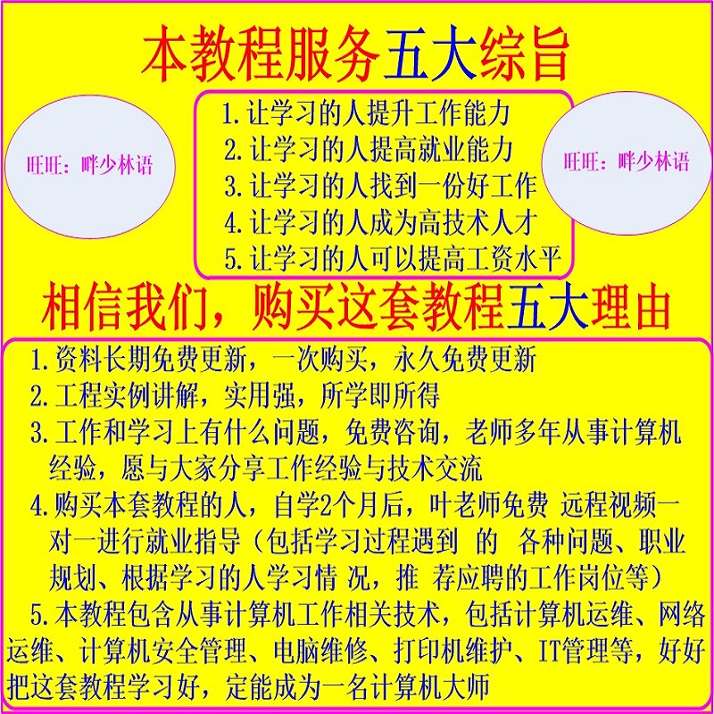 1-Computer computer operation and maintenance technology 2-Computer network troubleshooting technology 3-Basic server technology 4-Enterprise WLAN networking and maintenance 5-Broadband router configuration combat 6-Computer numbers