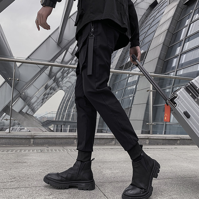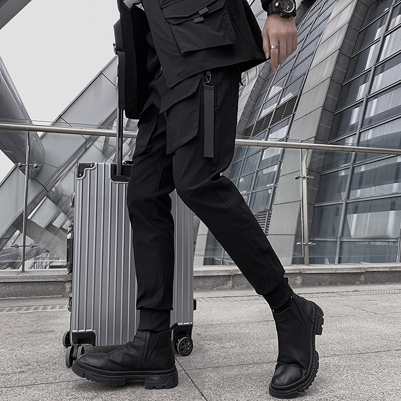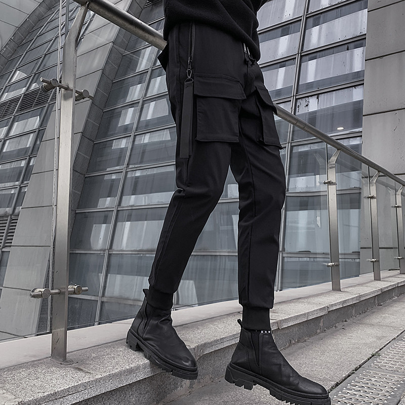 Dark overalls pants men's autumn and winter Korean version of the trend Joker plus velvet thickened Tide brand function ruffles casual pants