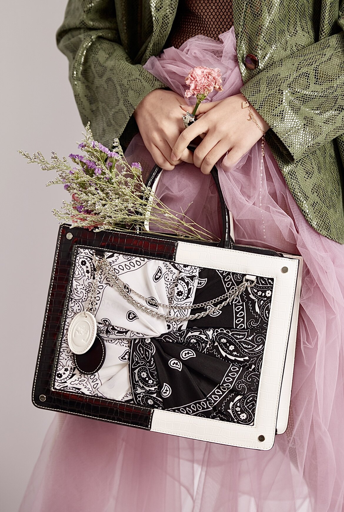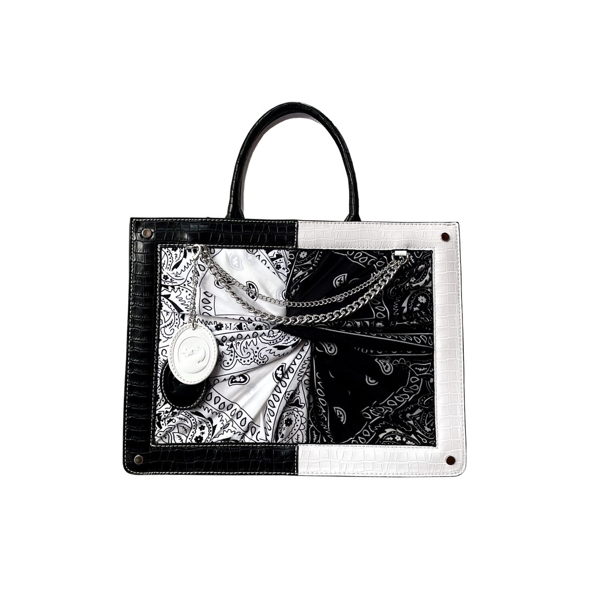 Cultivator's original street trend blockbuster black and white contrast panels are made from crocodile-print cashew flower scarf tote bag