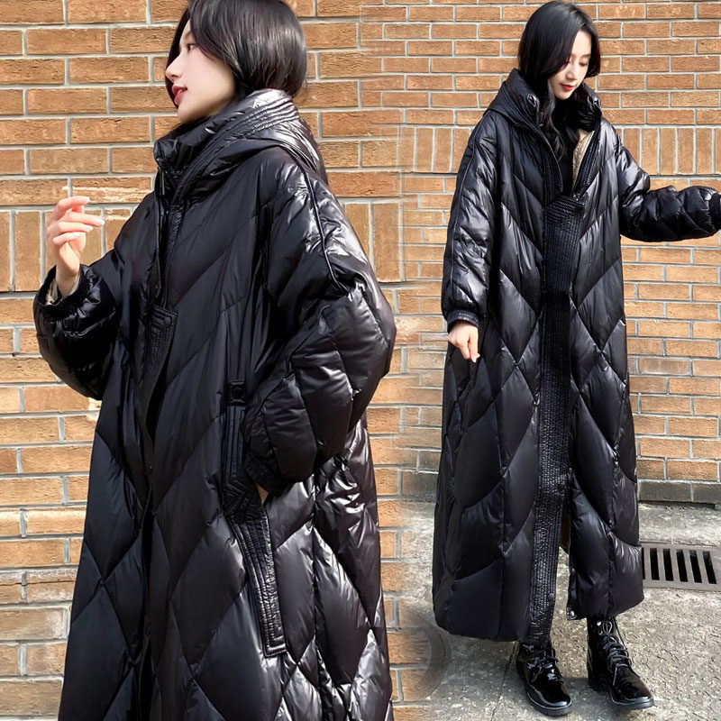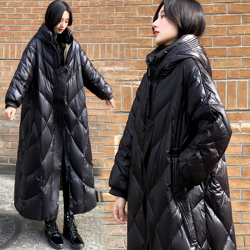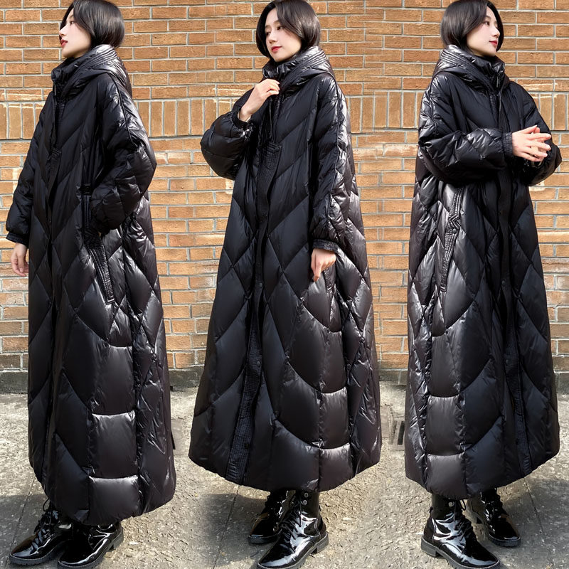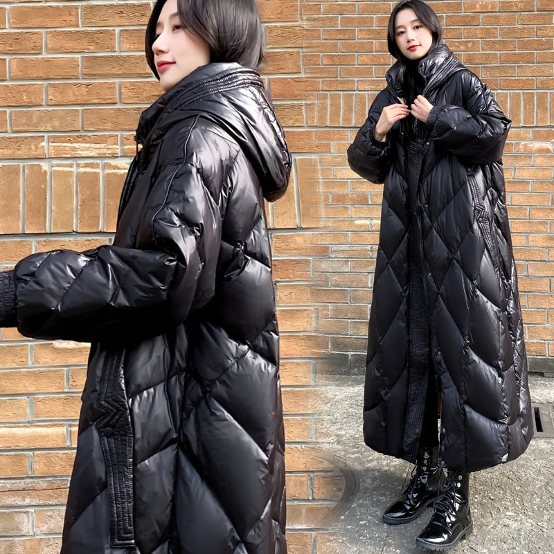 2023 new women's dress Winter extra-long sequel with bright face down jacket woman black even cap over knee white duck suede jacket thickened-Taobao