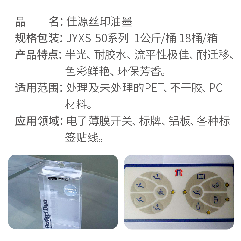 Online version Print Screen printing inks JY-50XS series PET adhesive labels PC plastic black white toning