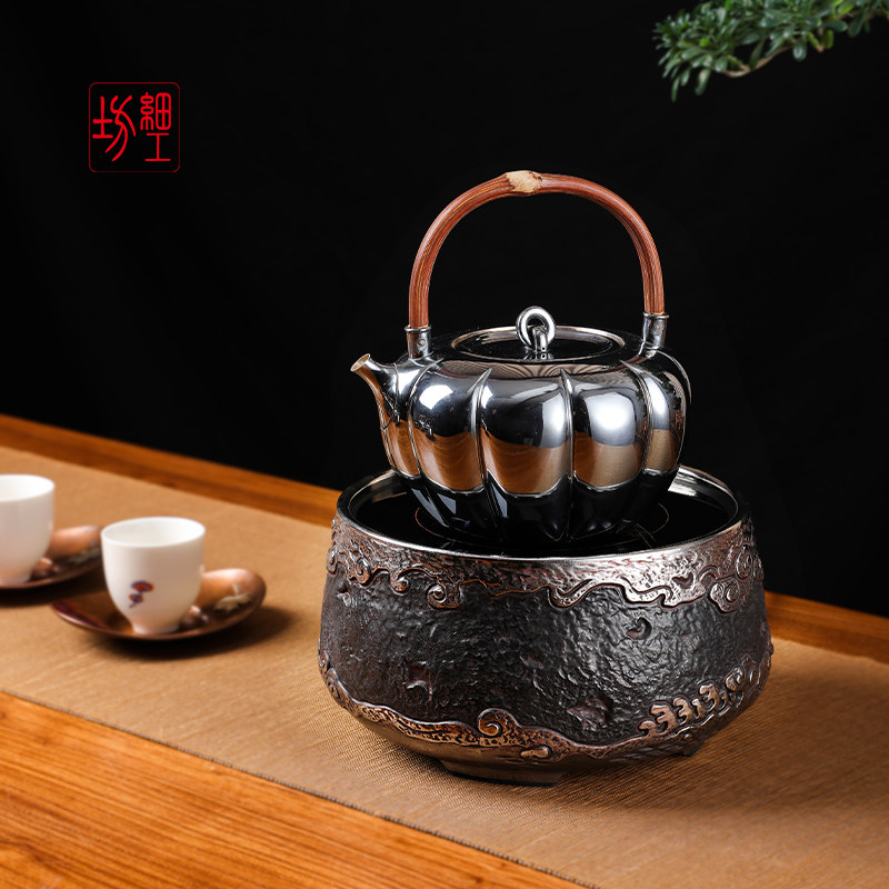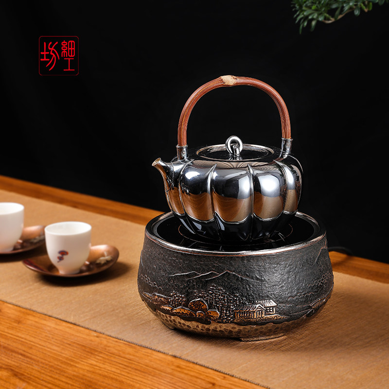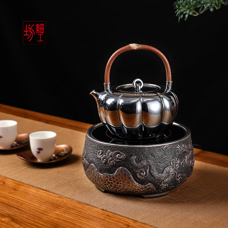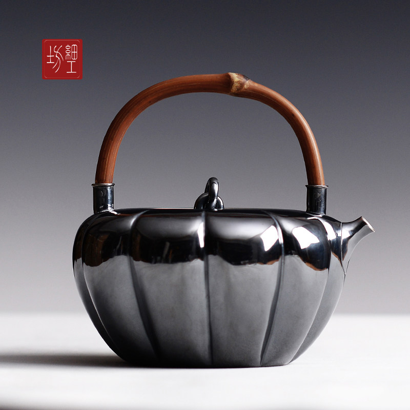 Fine workshop silver pot, sterling silver 999 kettle, hand-made with a silver mouth, Japanese silver pot pumpkin smoked silver