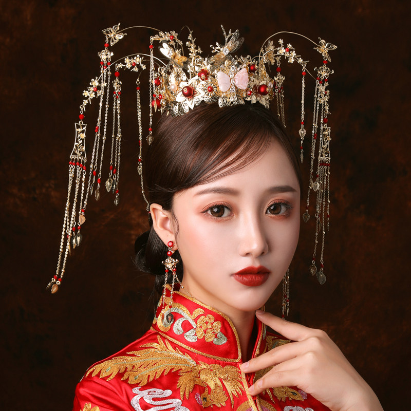 Bridal Chinese ancient clothes head decorated with golden retro palace flow Su hairpin show and dragon and phoenix hanging ancient wind ornaments Ji-wen