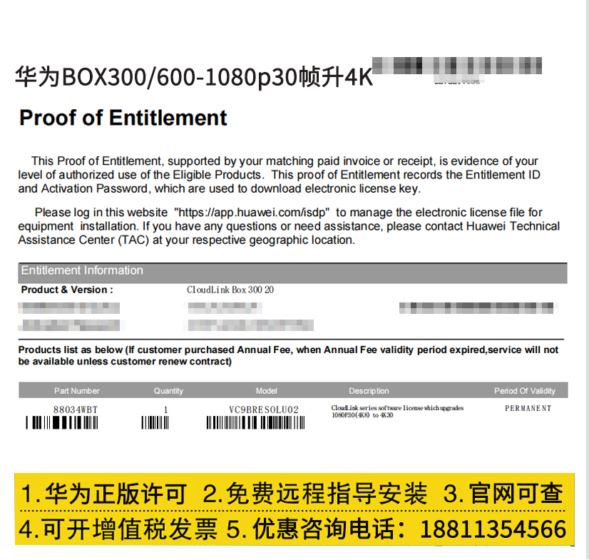 Huawei TE box series terminal 1080P30 upgrade license 1080P60 software license 720p