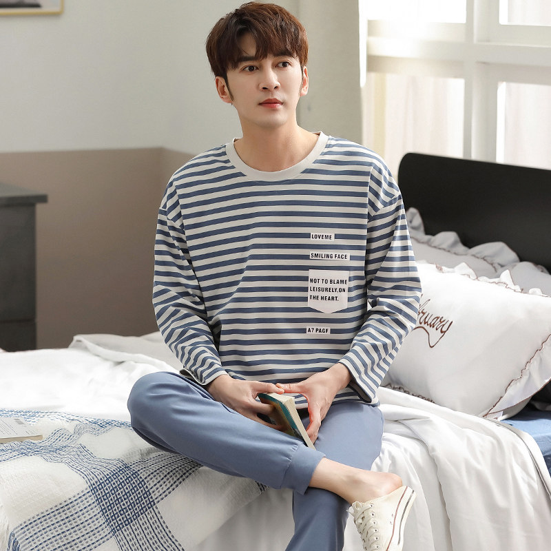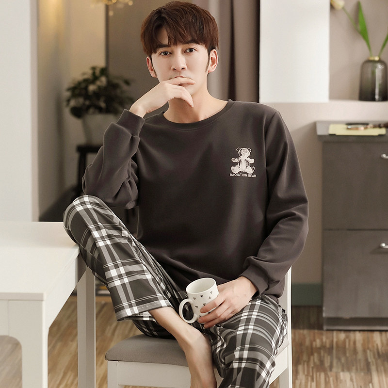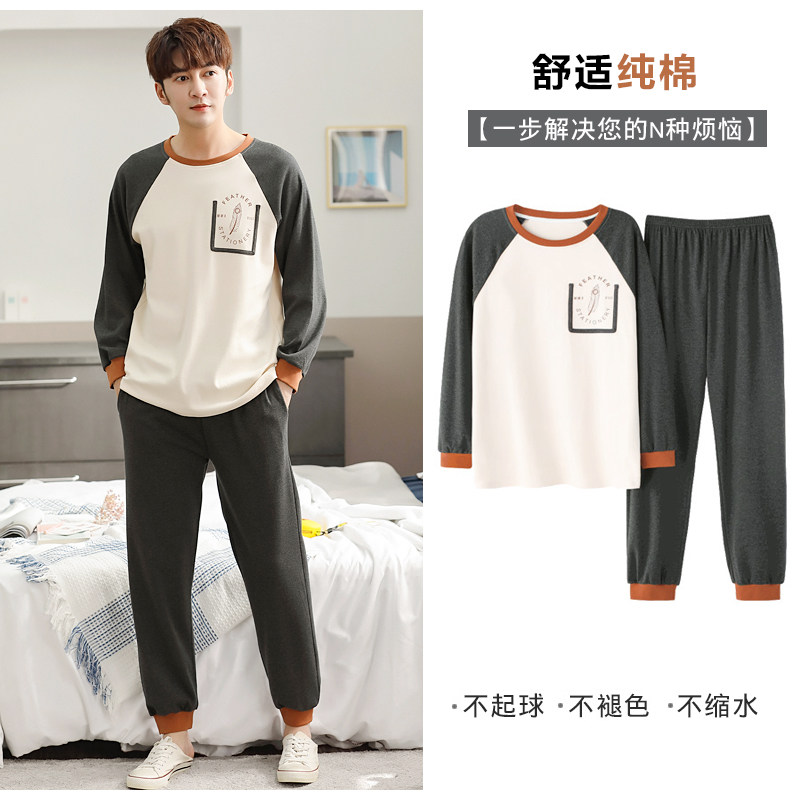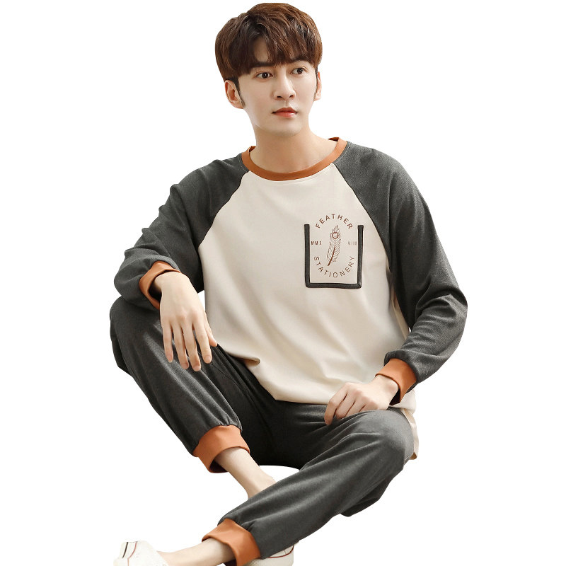 Men's pajamas men's spring and autumn cotton long-sleeved youth men's autumn leisure can go out feather homewear