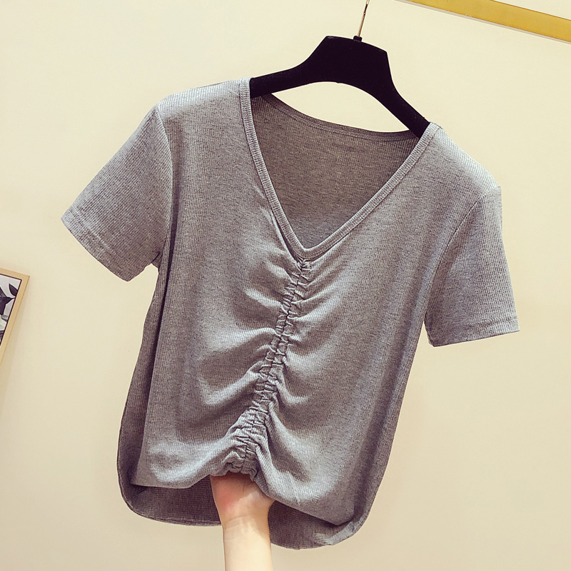 Tide brand v-neck drawstring knitted top women's 2021 summer new Korean version loose slim casual all-match short-sleeved T-shirt