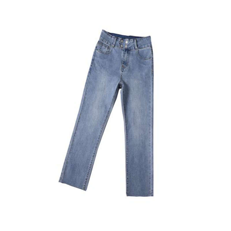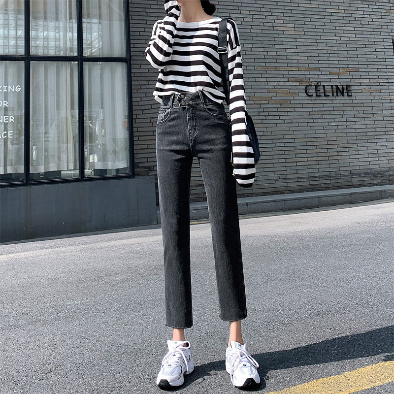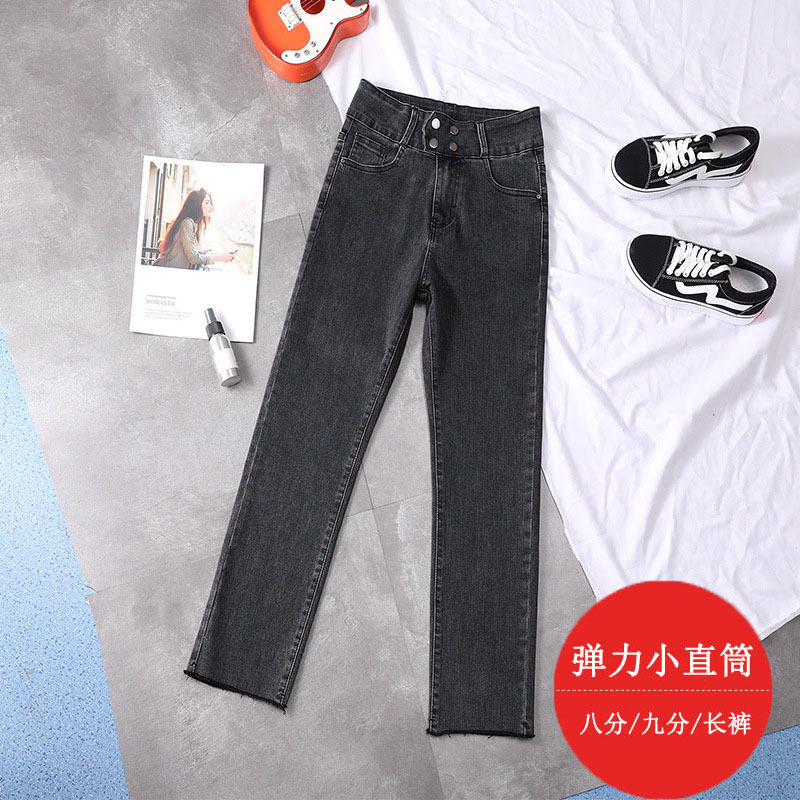 European version of black straight-leg pants women's buckle high waist elastic slim eight-point small man 2021 spring slim nine-point pants