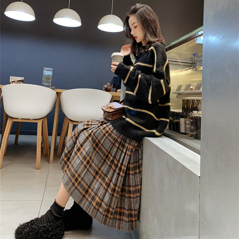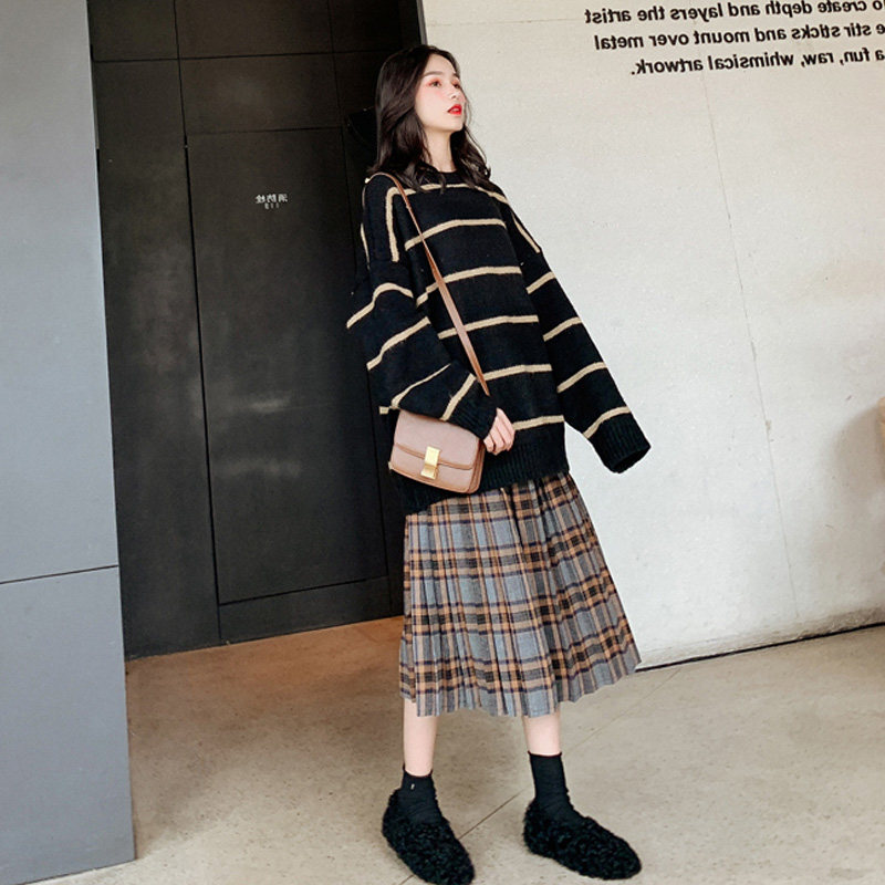 Large size women's autumn and winter new fat sister slimming striped sweater two-piece suit slimming and age-reducing dress