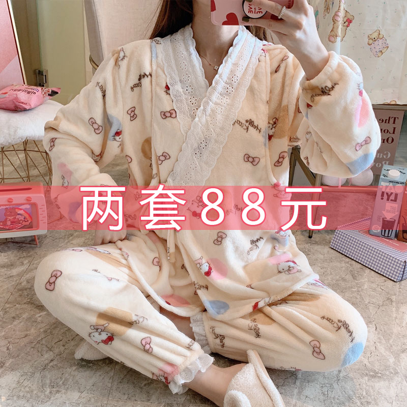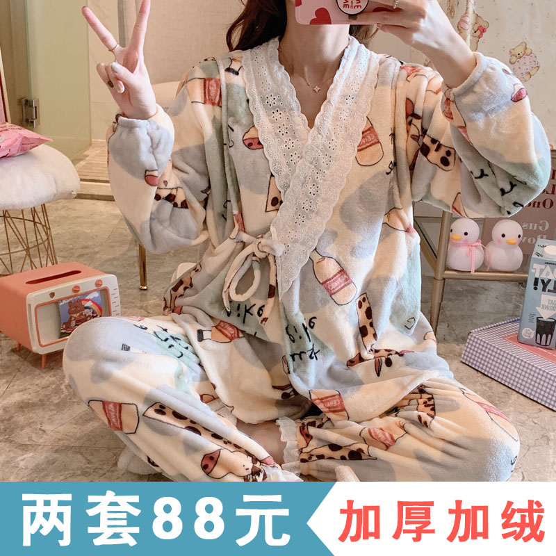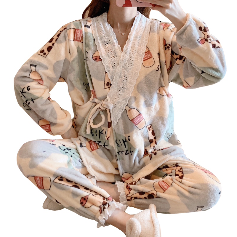 Pregnant women pajamas autumn and winter coral velvet kimono confinement clothing thickened plus velvet postpartum breastfeeding pregnancy homewear women