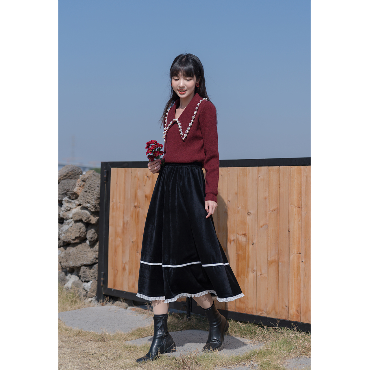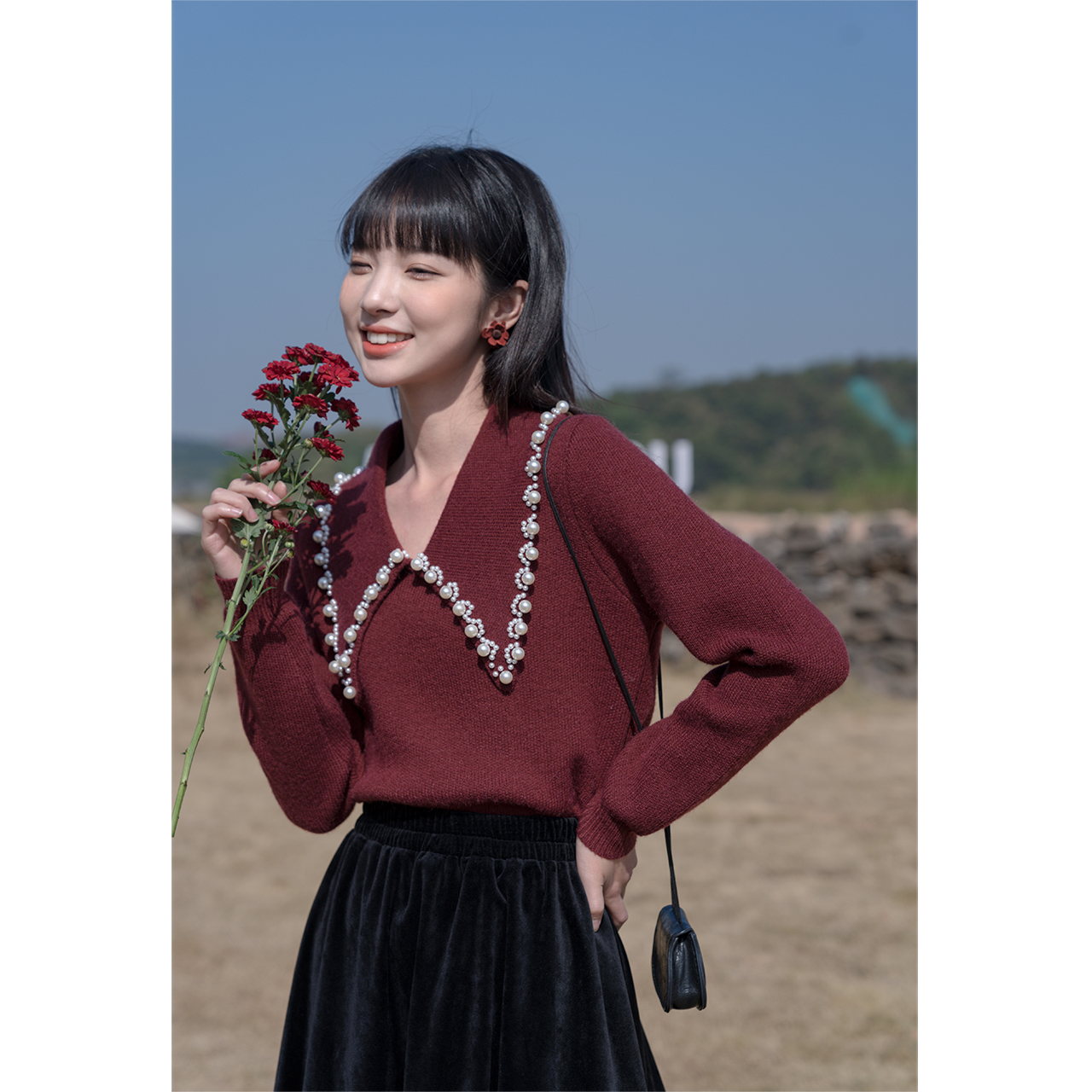 Deer to the south Red sweater woman autumn and winter knitting Foreign school niche temperament lapels loose base versatile lazy