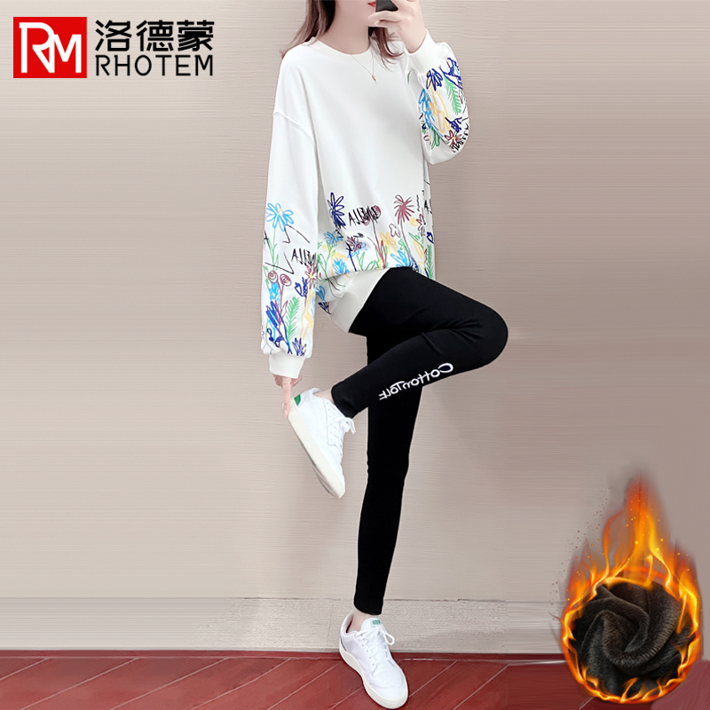 Medium and long version of vests women's autumn and winter plus velvet padded 2021 new loose printing casual pants two-piece set
