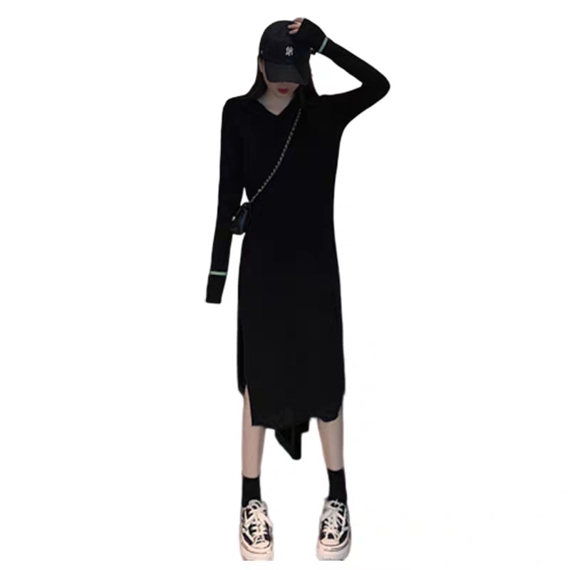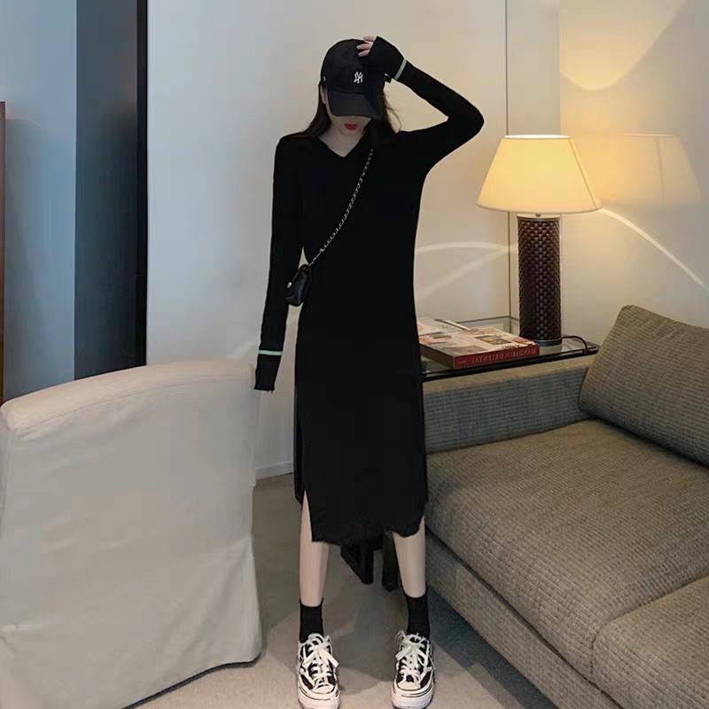 Hooded bottoming sweater skirt women's autumn and winter long version over the knee small loose and thin temperament with knitted dress