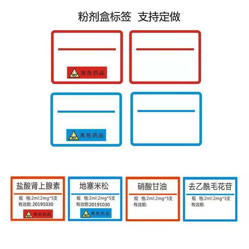 Red Blank powder container label Yellow Blank powder container label Blue Blank powder container label Red Powder container label High-risk yellow Powder container label High-risk blue Powder container label