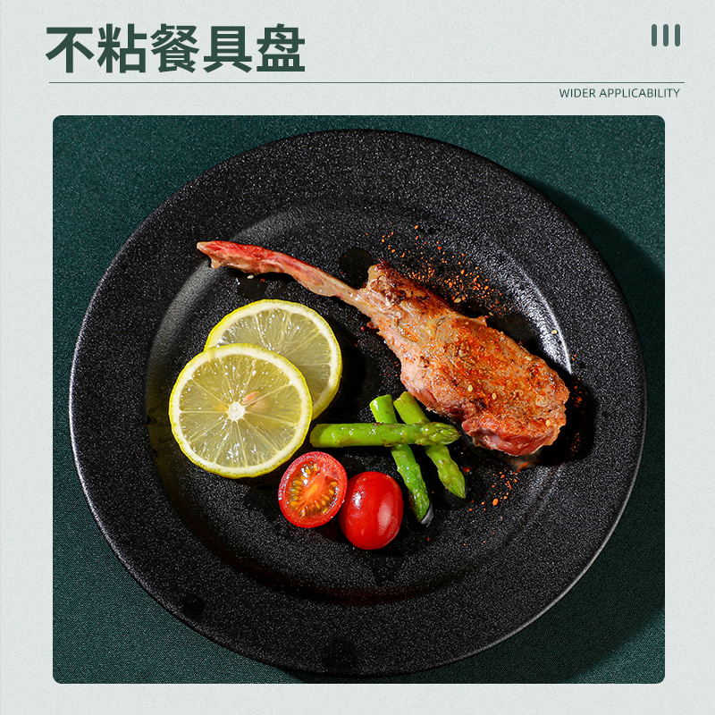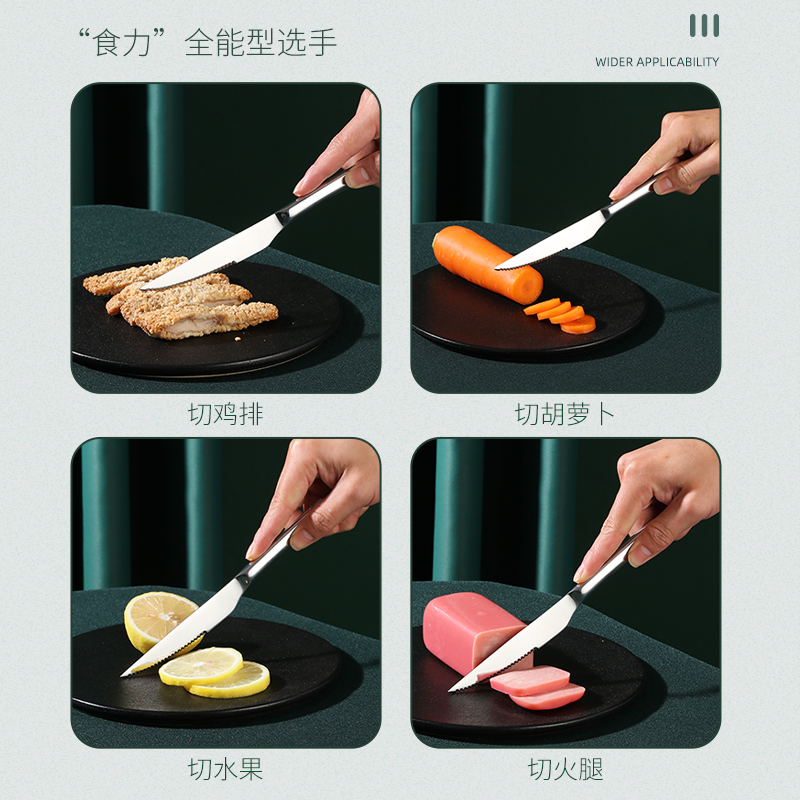 Steak knife and fork(natural) Steak knife and fork spoon(natural) Steak knife and fork(natural) Round flat plate (black) Steak knife and fork spoon (natural) Round flat plate (black) Steak knife and fork