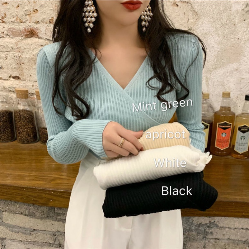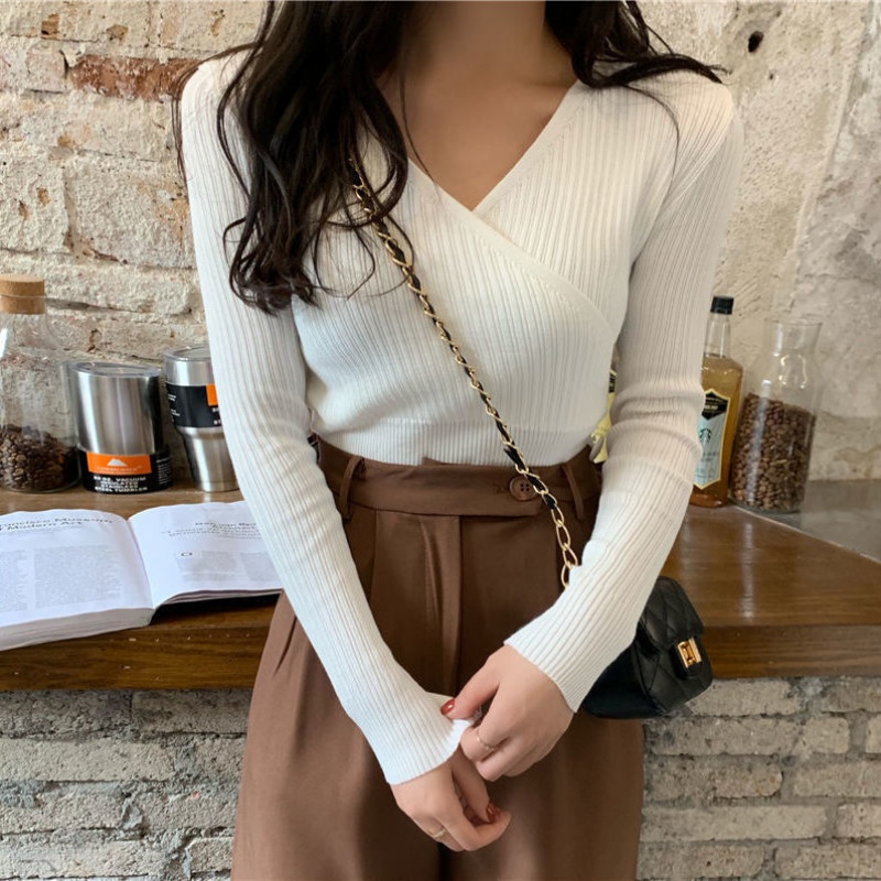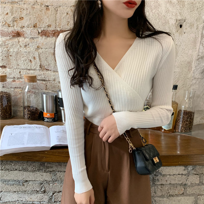 New autumn and winter sleeve in red hundred and fixed thin V-collar cross long sleeve knitted shirt tops