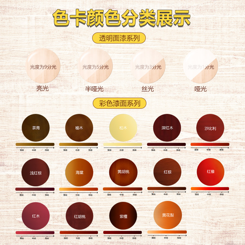 White off-white transparent matte (varnish) transparent mercerizing (varnish) transparent semi-matte (varnish) transparent gloss (varnish) tea green begonia black walnut red mahogany red light red palm yellow walnut yellow rose rosewood sapi pine wood elm red oak French blue gray green retro green