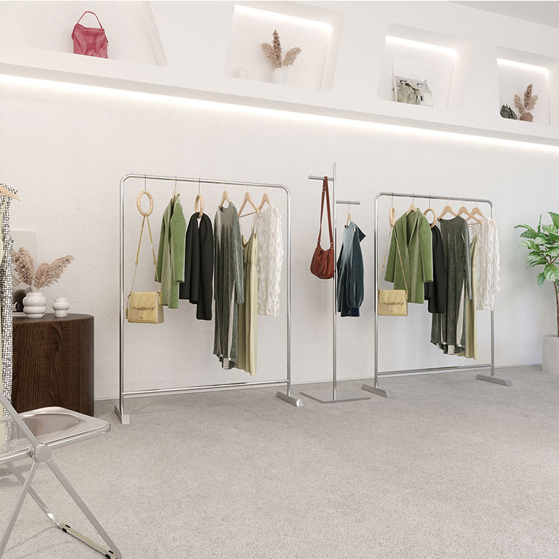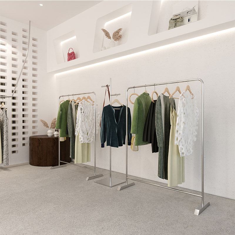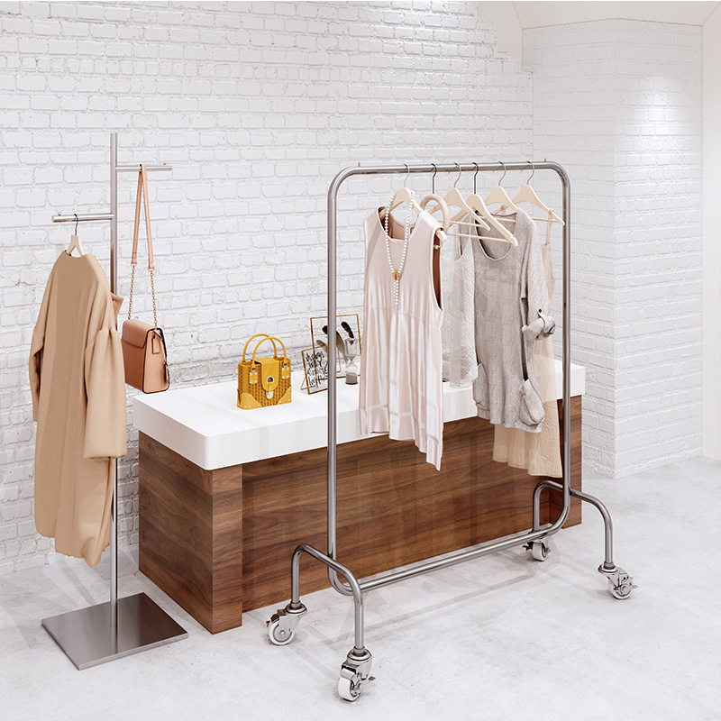 Clothing store stainless steel brushed silver boys and girls store shelf display stand floor-to-ceiling hanging rail Nakajima display rack