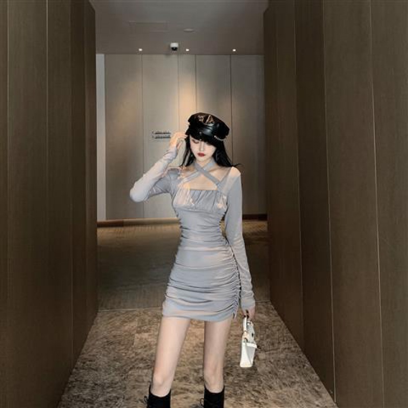 Fall/Winter 2022 New Slim Dress Sexy Cross-Tie Hanging Neck Wrinkled Slim Hip Dress