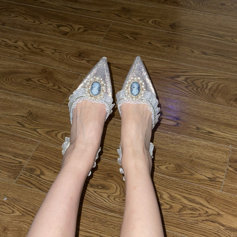 Treasure link Niche models Artifact for taking photos~~Silver tin gray wedding shoes Crystal heel pointed high-heeled shoes