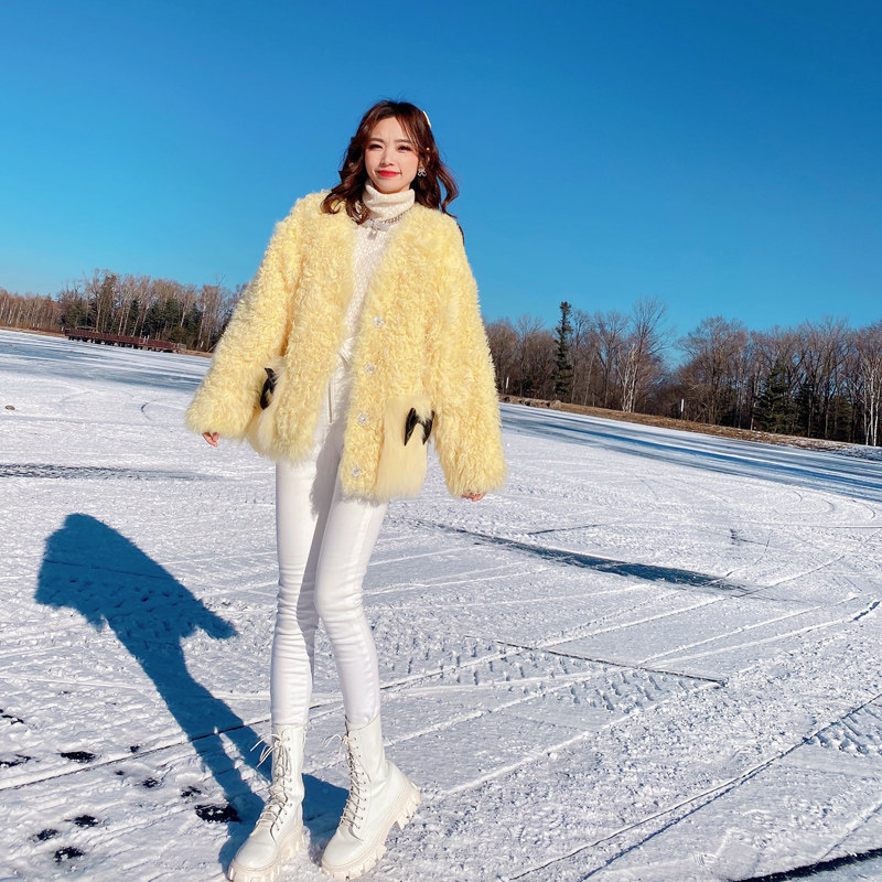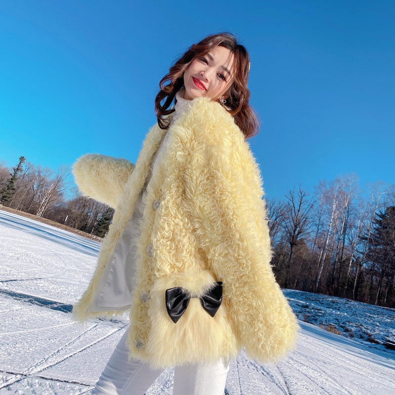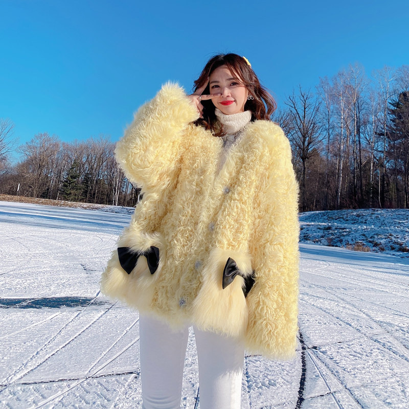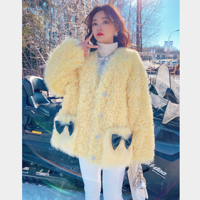 Miss Luxury "Amiu girl" British imported sheep curly fur one-piece fur coat female yellow