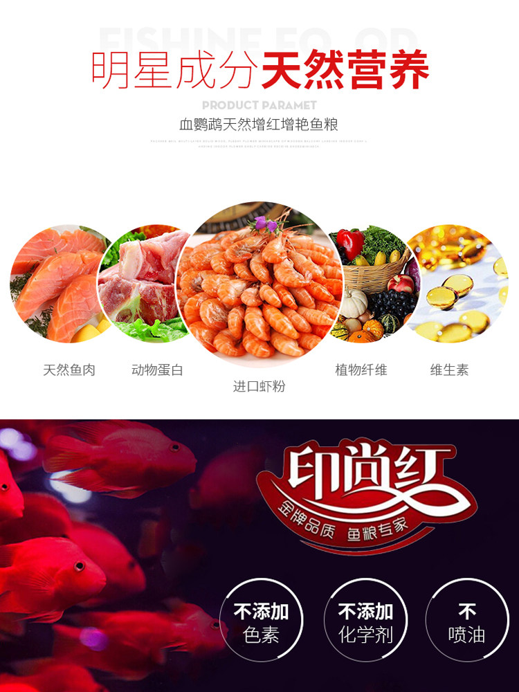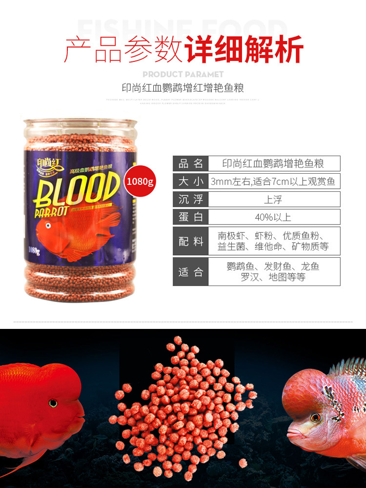 Printed and red blood parrot gin carp feed with red colour-enhancing spirulina floating down to fish food high nutrient fish food