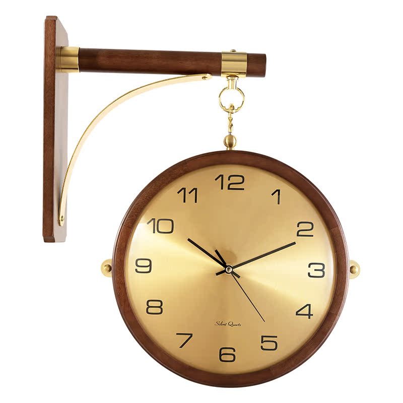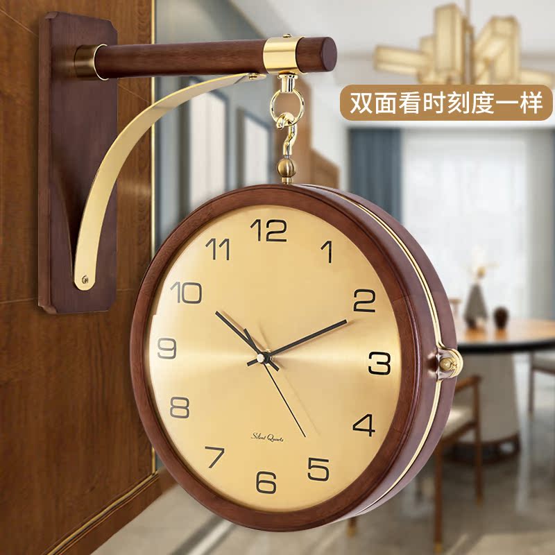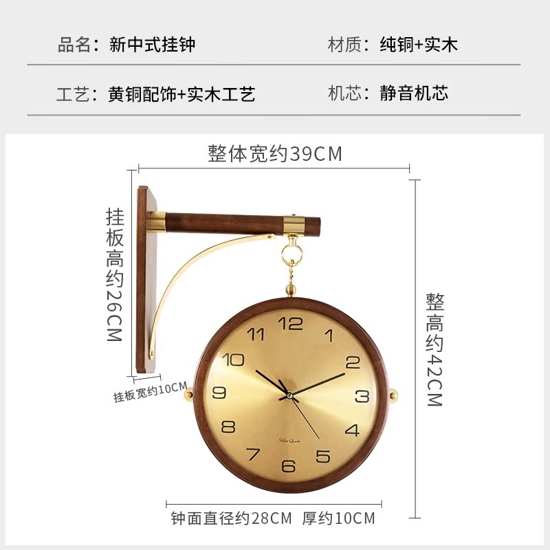 Light luxury modern simple brass solid wood double-sided clock household watch New Chinese wall clock Living room mute wall clock