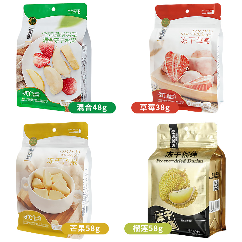 Freeze-dried strawberries 38g*3 packs (about 30 small boxes) Lyophilized mango 58g*3 packs (about 30 small boxes) Three kinds of fruit mix 48g*3 packs (about 30 small boxes) Freeze-dried durian 58g*3 packs (about 30 small boxes) 2 packs of freeze-dried strawberries + 1 pack of freeze-dried durian (about 30 small boxes) 2 packs of freeze-dried strawberries + 1 pack of freeze-dried mango (about 30 small boxes) Strawberries + mango + Durian 1 pack each (about 30 small boxes)