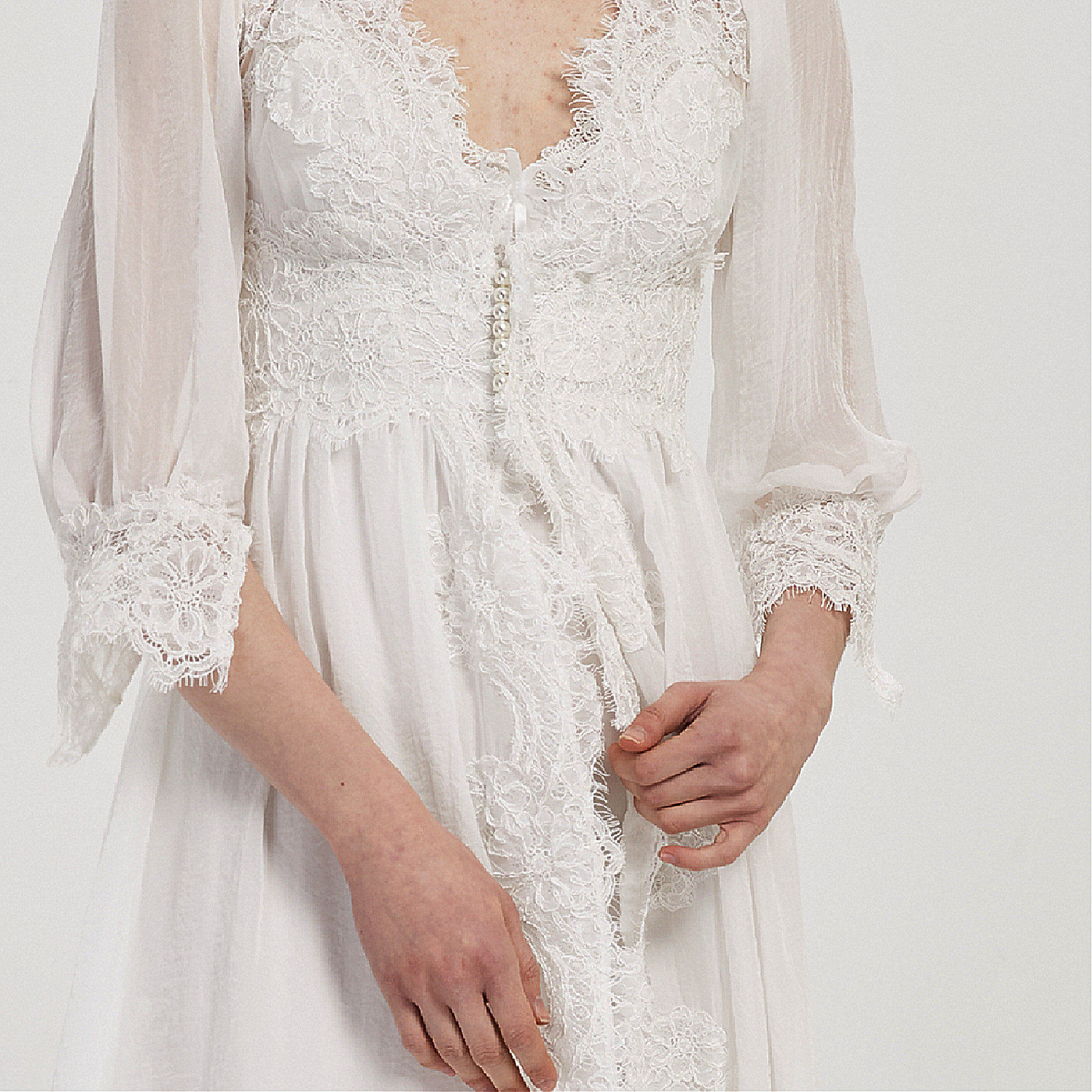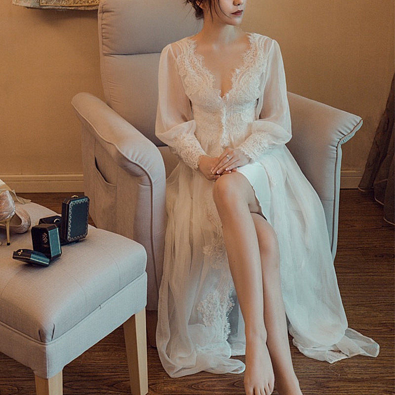 Fur morning robe bride wedding gift sexy lace white lace Vintage French tulle pajamas spring pearl buckle
