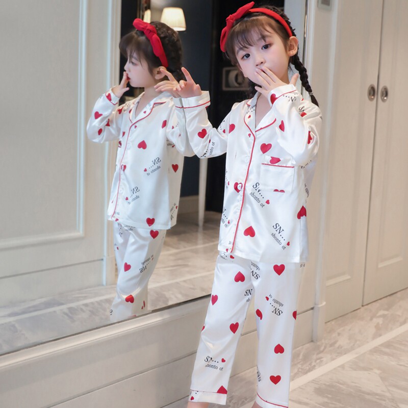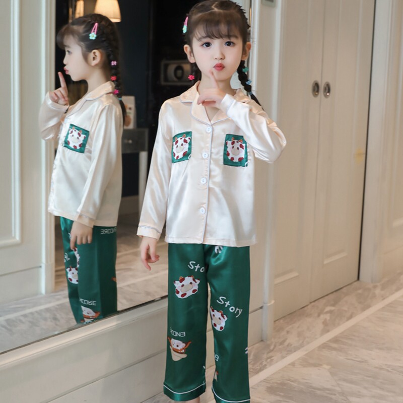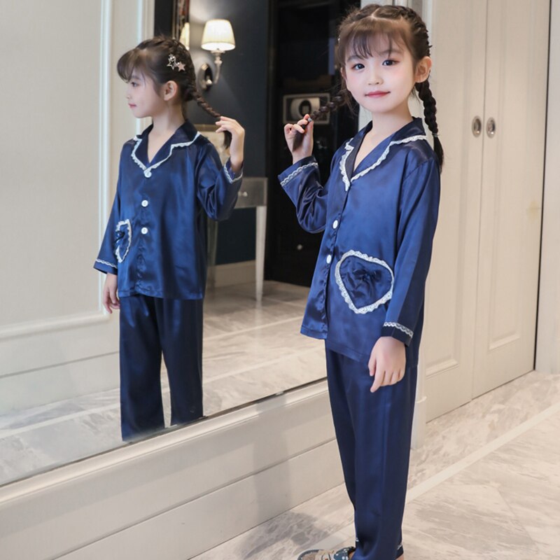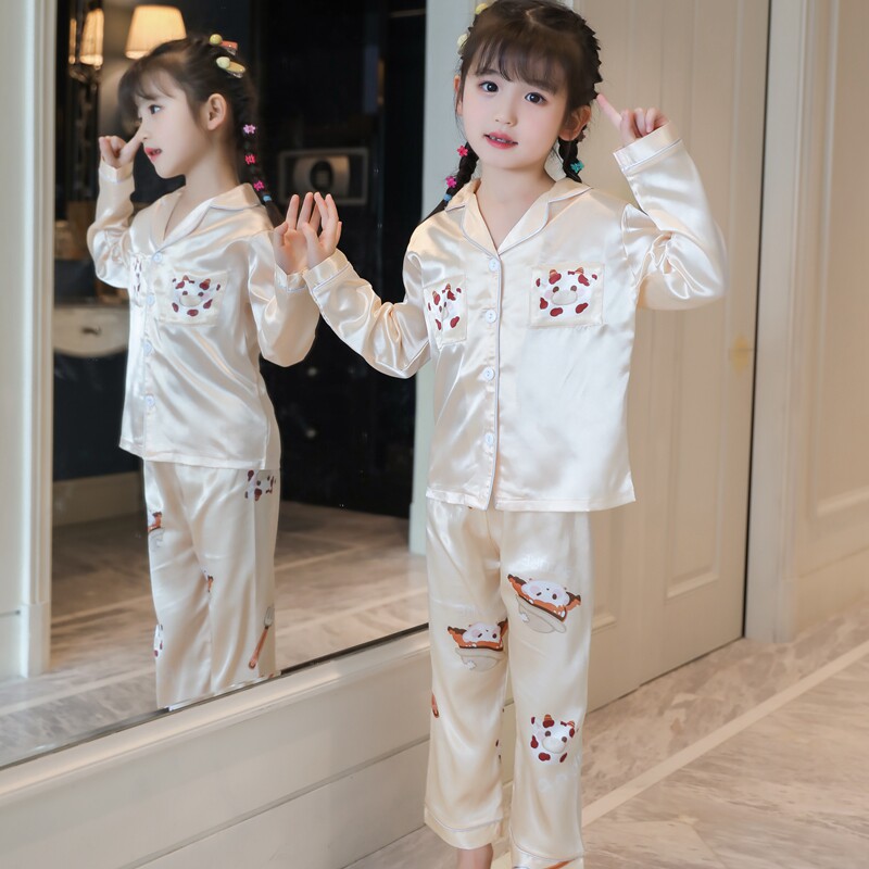 Simulation silk children's pajamas large size children's long sleeve baby girl ice silk spring and autumn silk suit home clothing