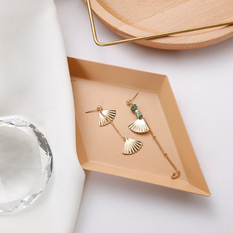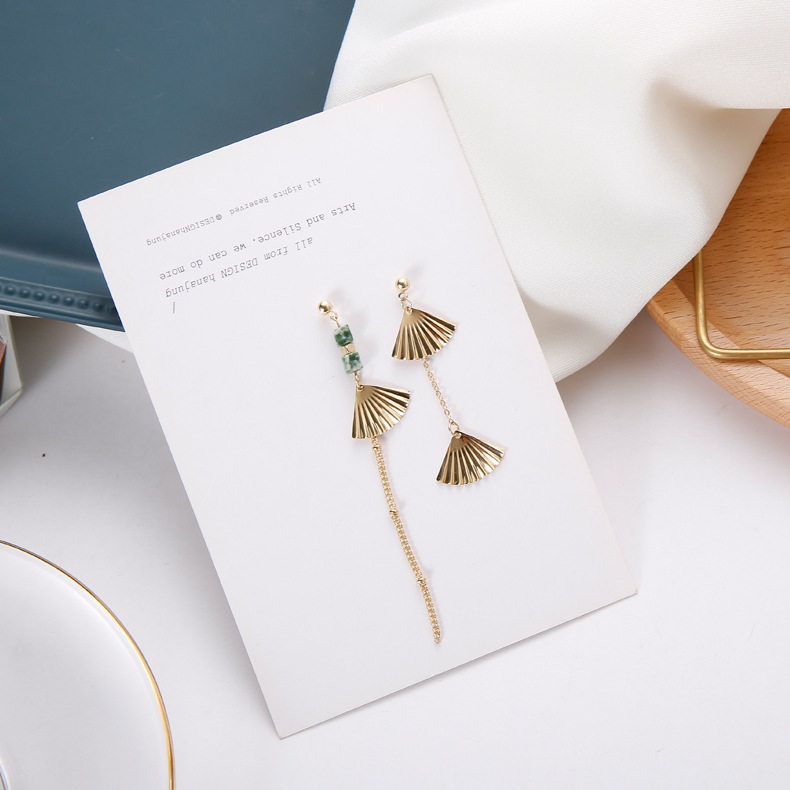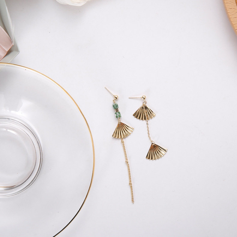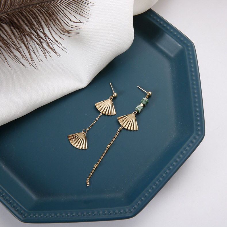Day-style hand for natural stone long version flow Suasymmetrical golden temperament ear-needle ear pendant retro fan earrings E4