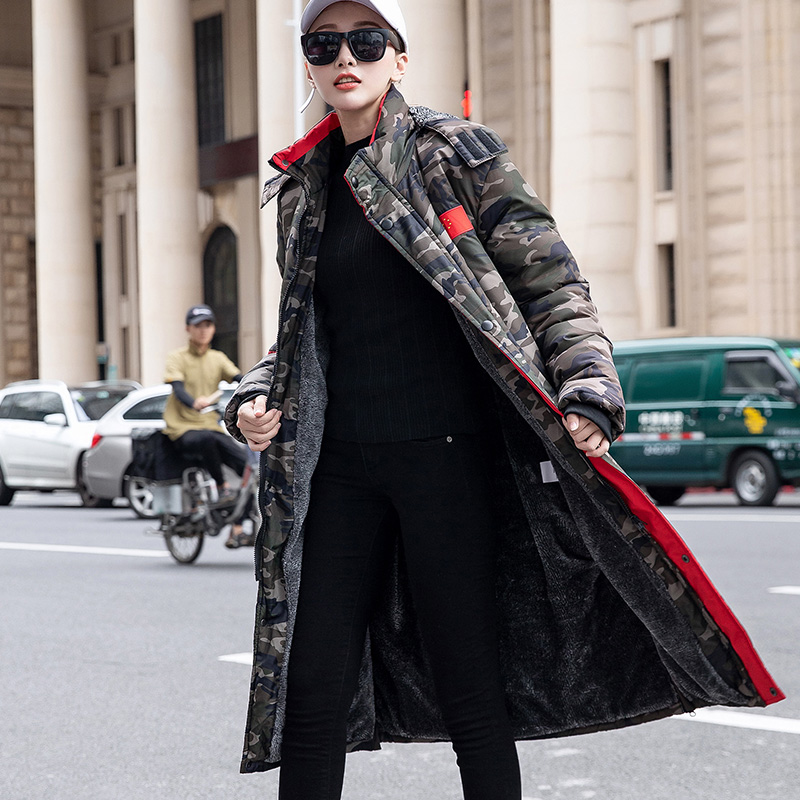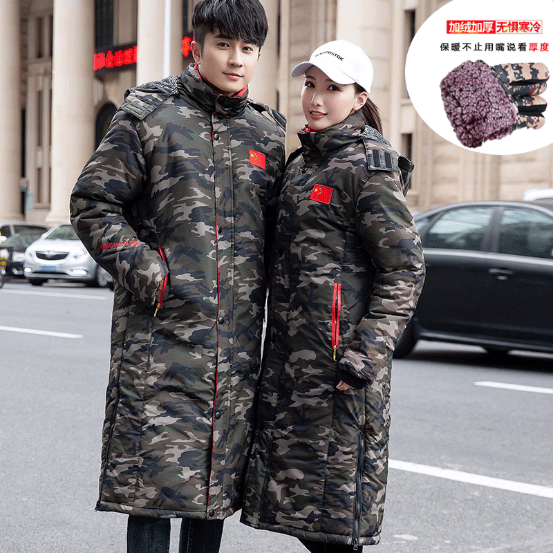 Dunlang genuine camouflage coat Men's winter thickened straight tube long section over the knee cotton coat women's velvet cold cotton coat