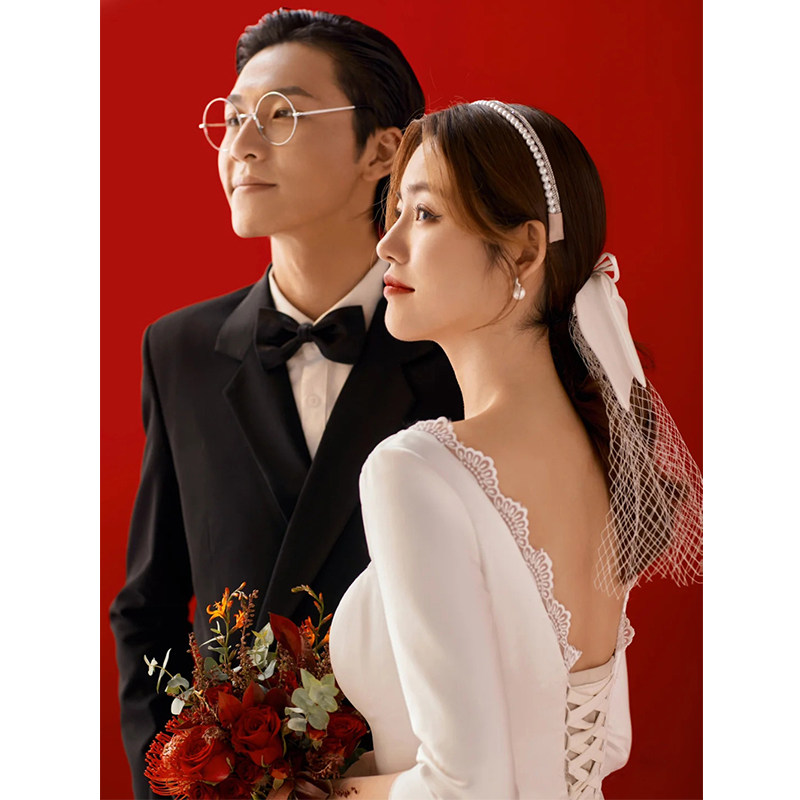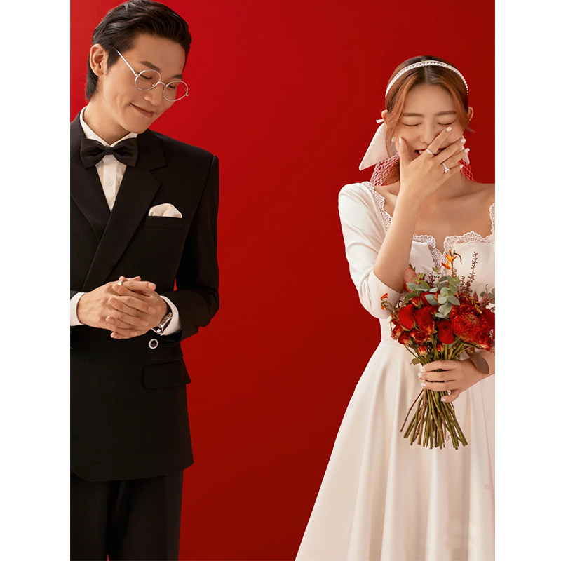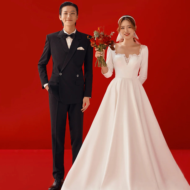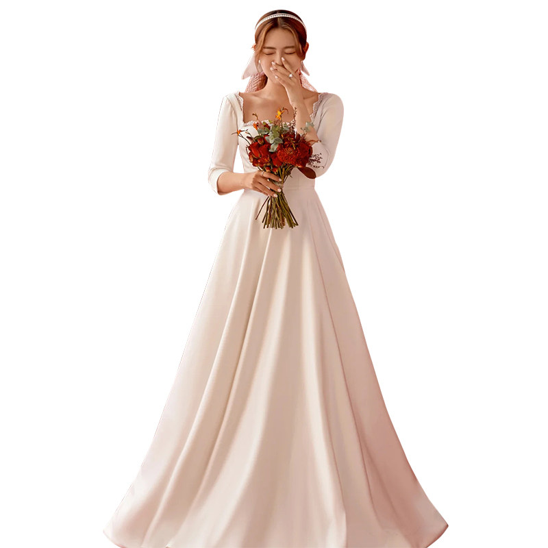 French wedding dress 2023 new bride greeted the dress with long sleeved satin out the gauze arm