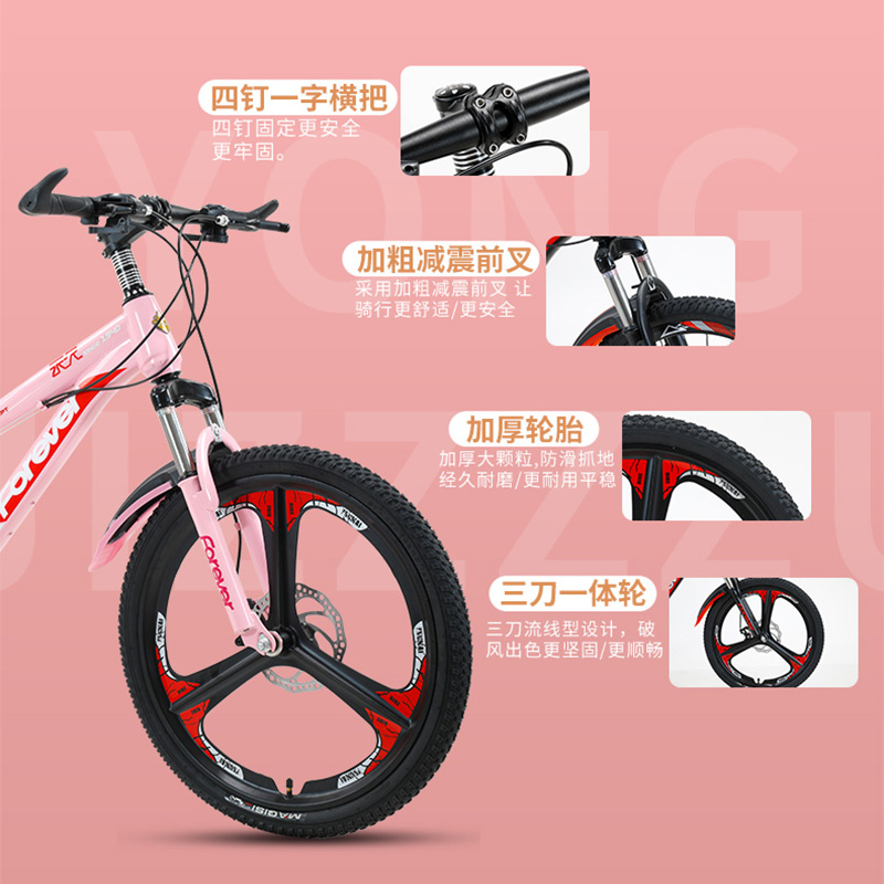 Pink 6-speed (spoke wheel shock-absorbing front fork double disc brake) fluorescent yellow 6-speed (spoke wheel shock-absorbing front fork double disc brake) black and red 6-speed (spoke wheel shock-absorbing front fork double disc brake)