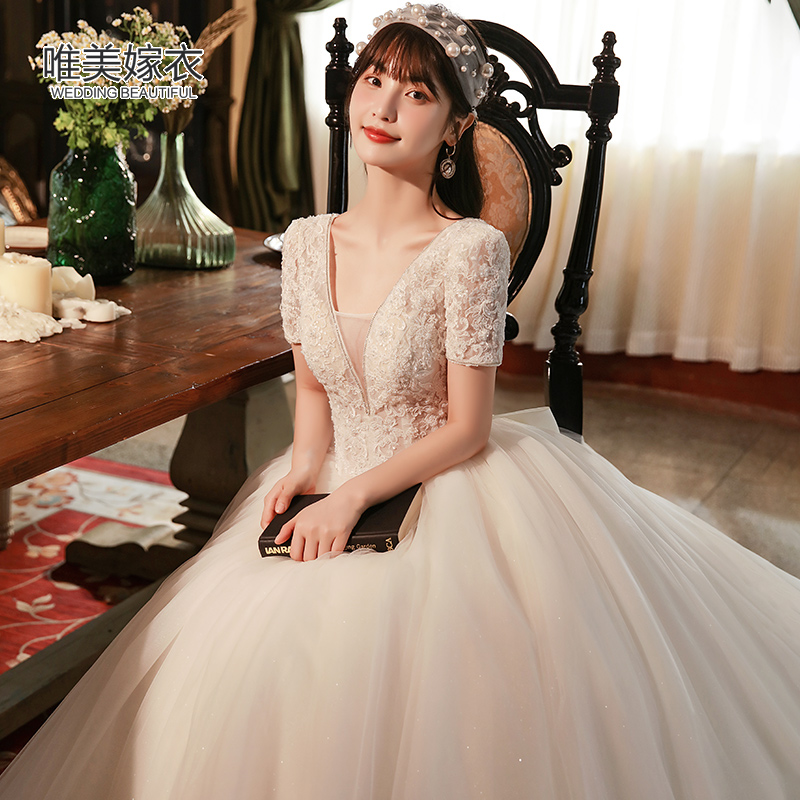 Wedding Dress 2022 New Big Trailing Lavish Temperament Bride Minima Atmospheric Advanced Sensation Retro Style V Collar Wedding Dress