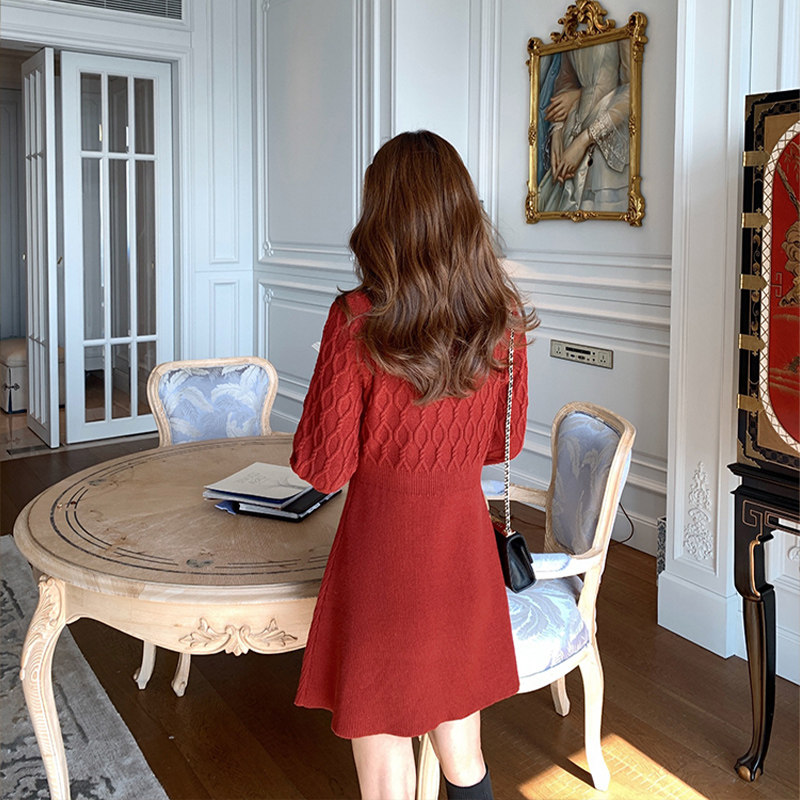 Little red dress Hepburn style back to the door engagement red bottoming knitted dress mid-length version over-the-knee sweater skirt women's autumn and winter