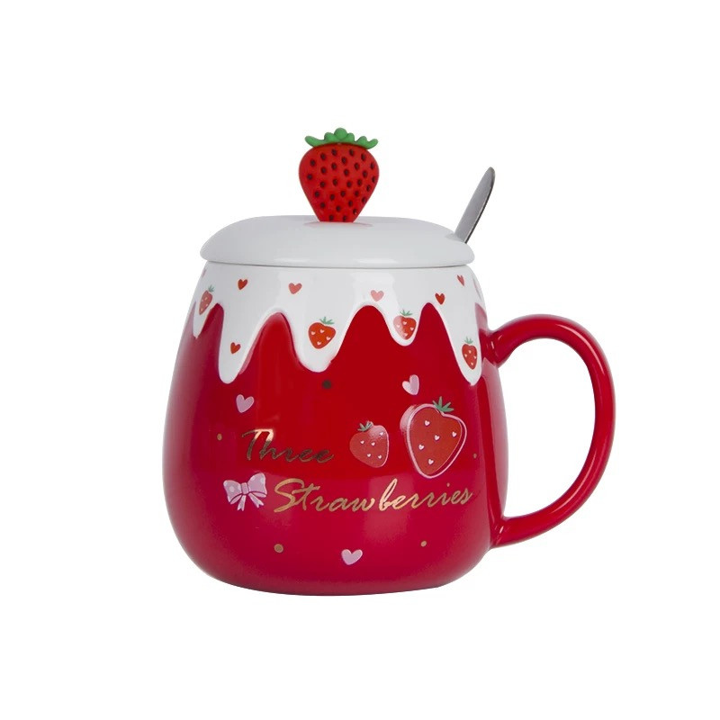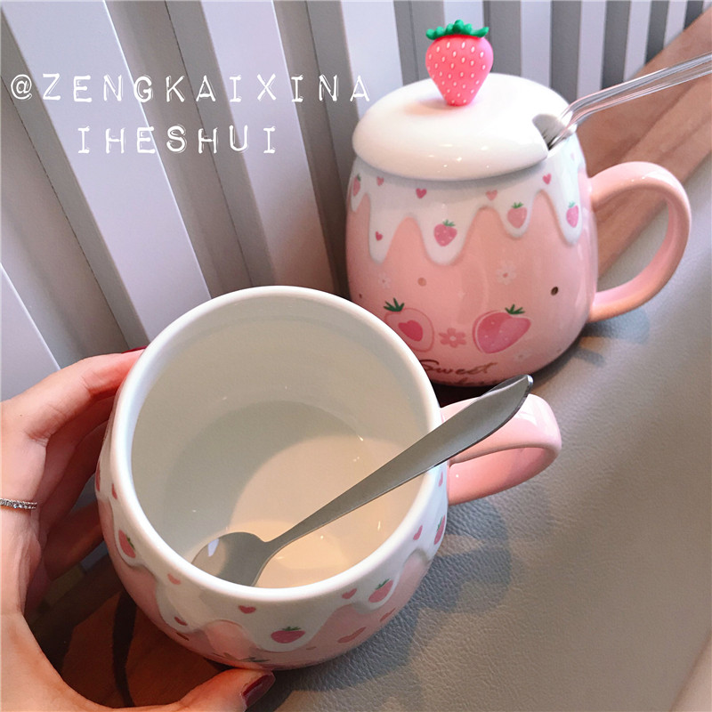 Cute strawberry water glass Sub-girl Heart Creative Ceramic Cup With Lid Spoon Straw Han Edition Mark Cup Cute
