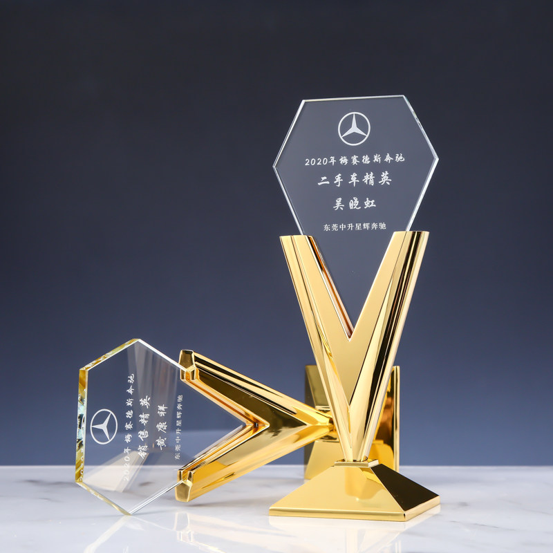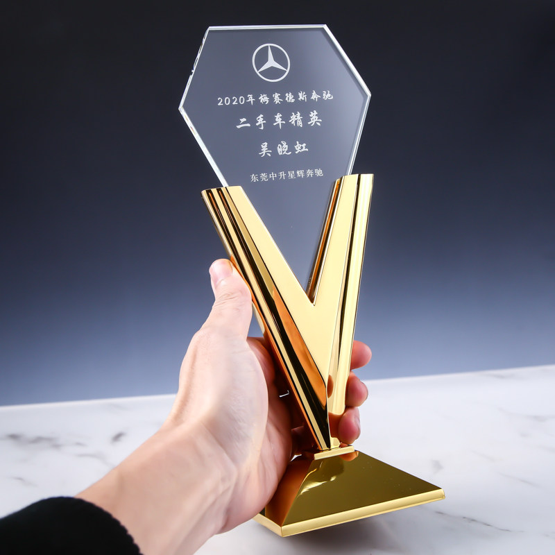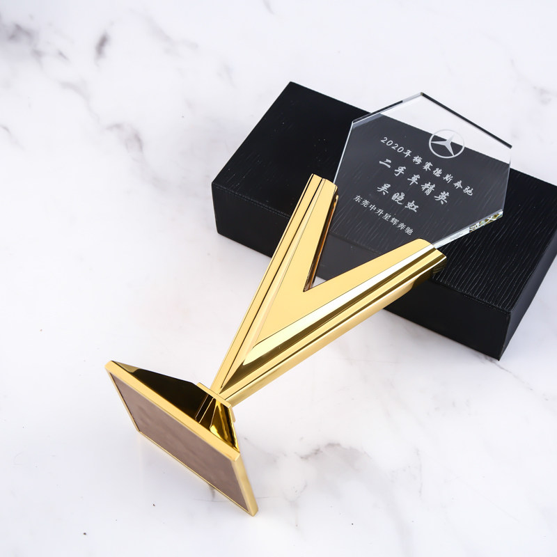 Crystal Trophy Medal Custom Upscale Creative V Character Plated Metal Excellent Sales Staff Company Annual Conference Awards