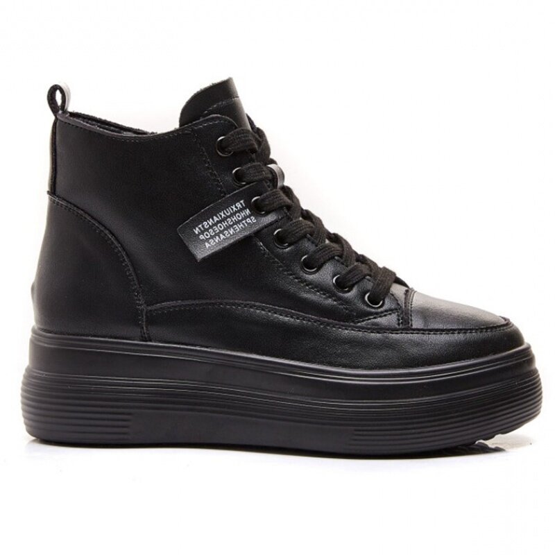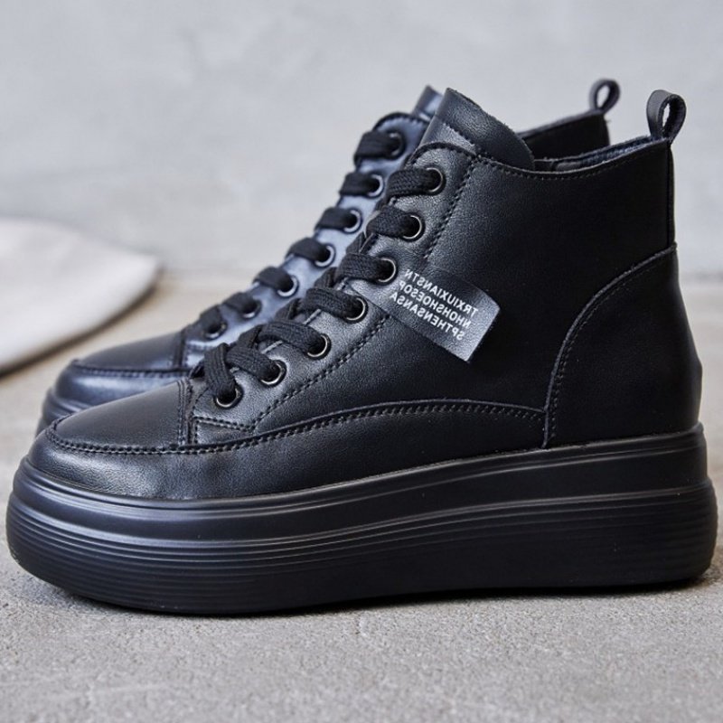 Hong Kong women's shoes for heightening spring and autumn 2022 new popular black leather thick-soled high tube platform shoes