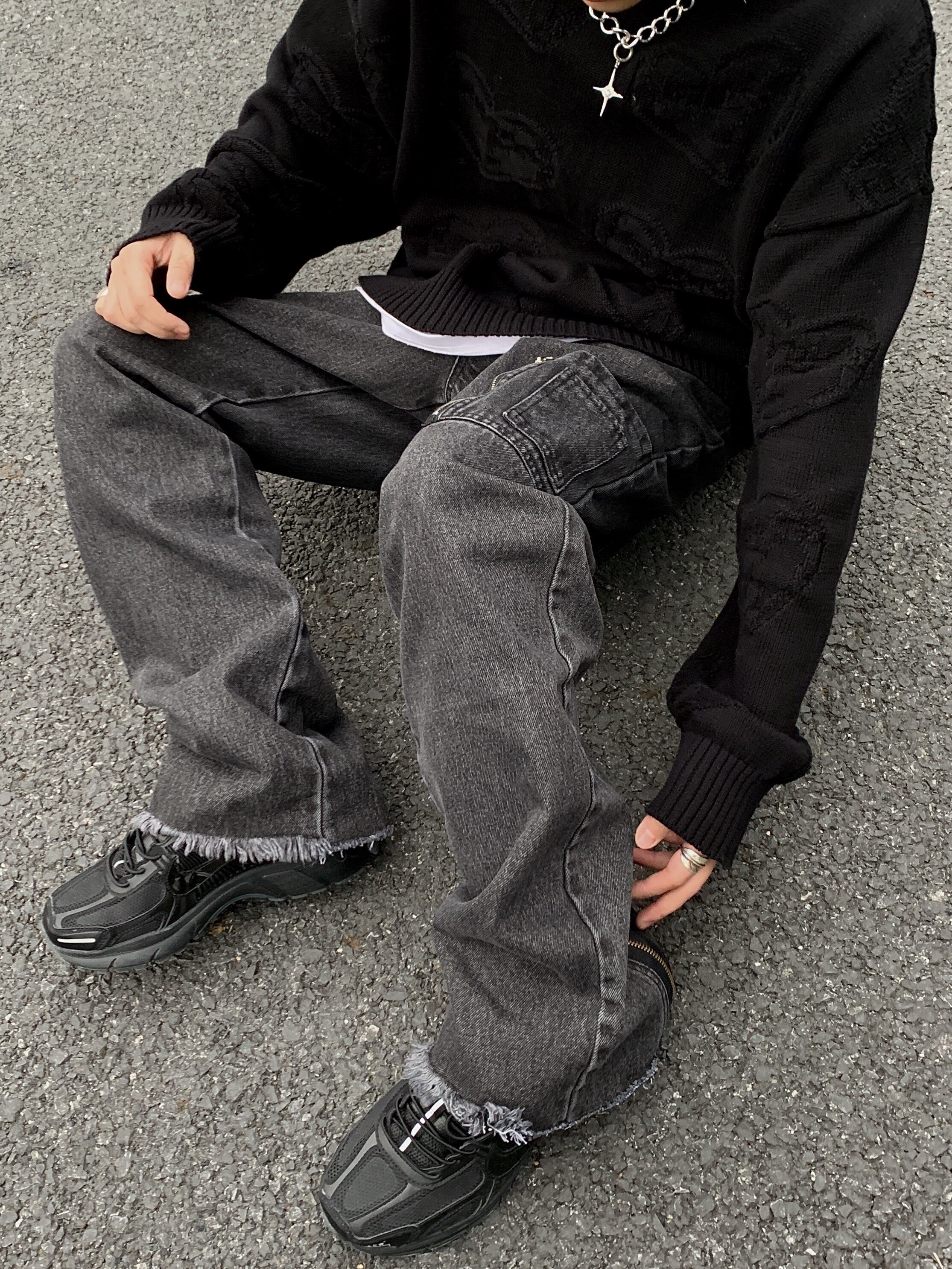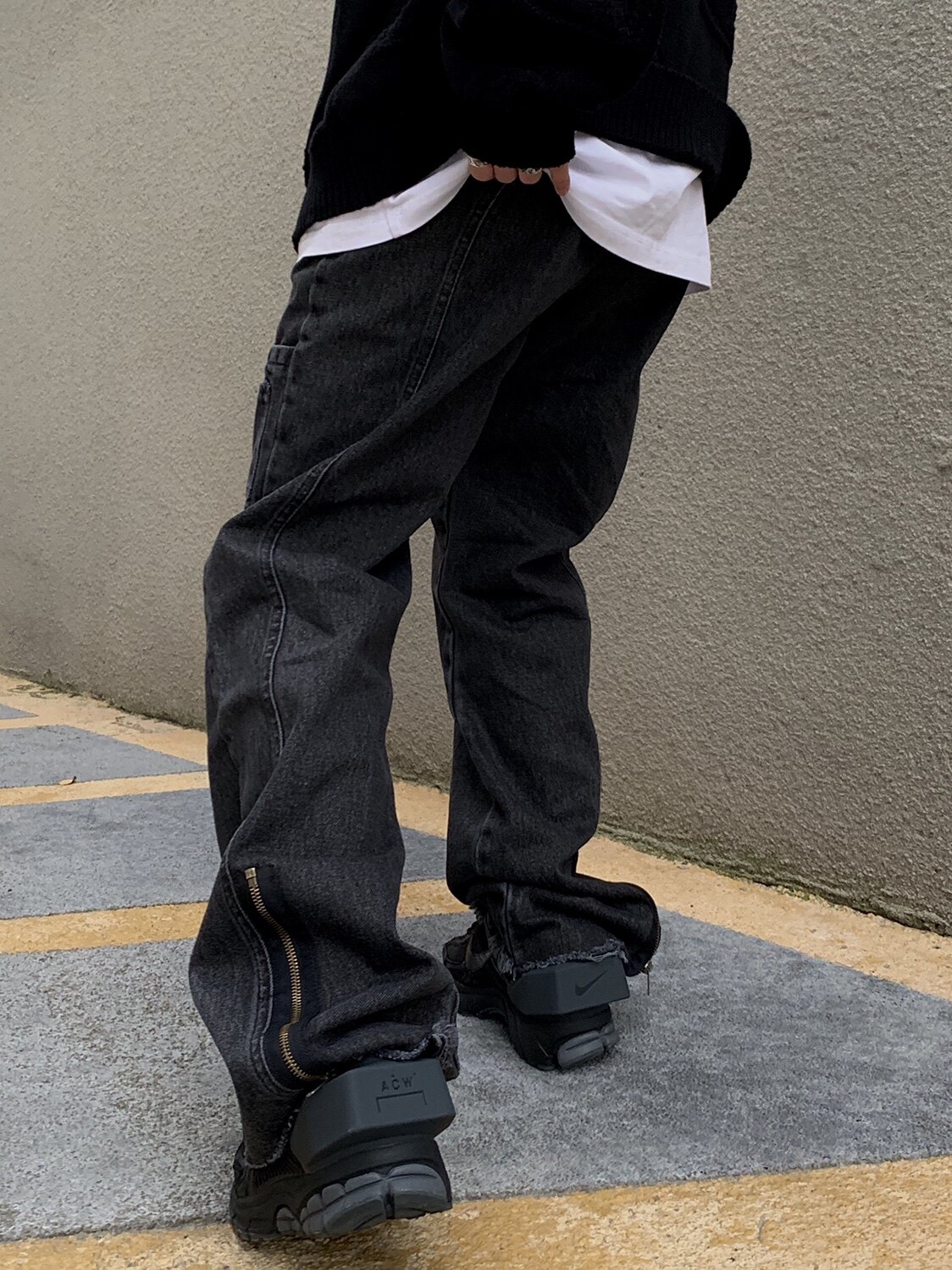 FORUYES (4UYES) Pocket Stitching Guochao Black Gray Washed Old Tassel Zipper Denim Micro Flared Pants