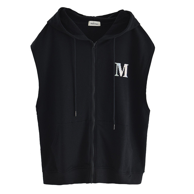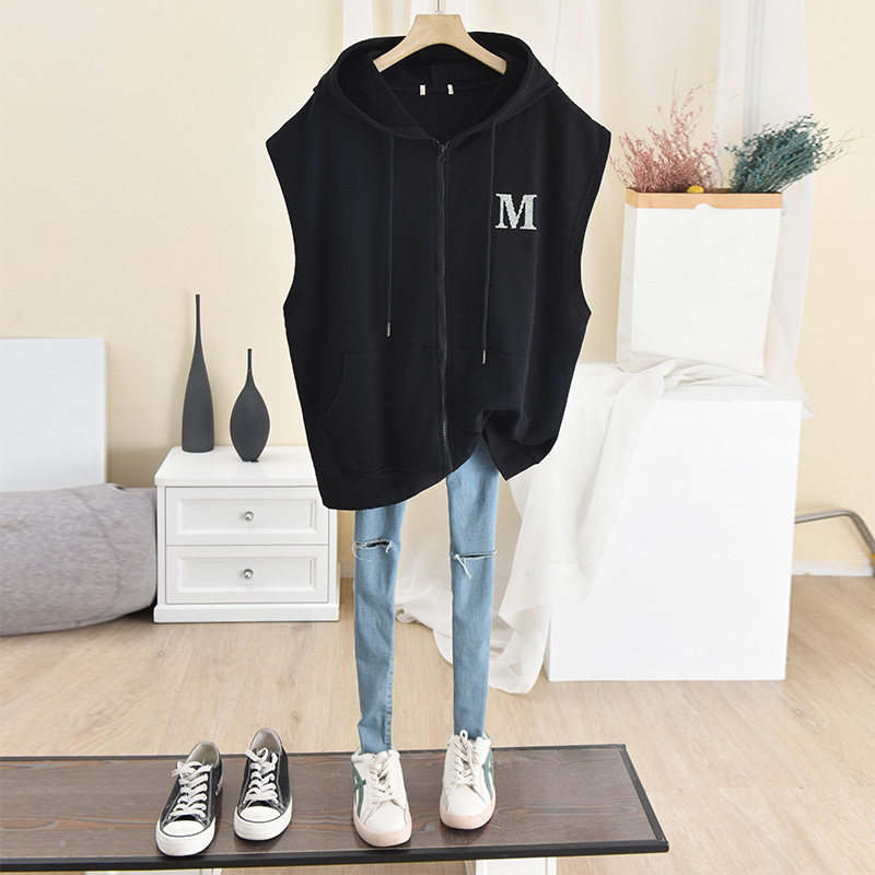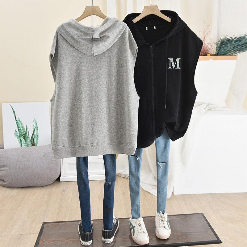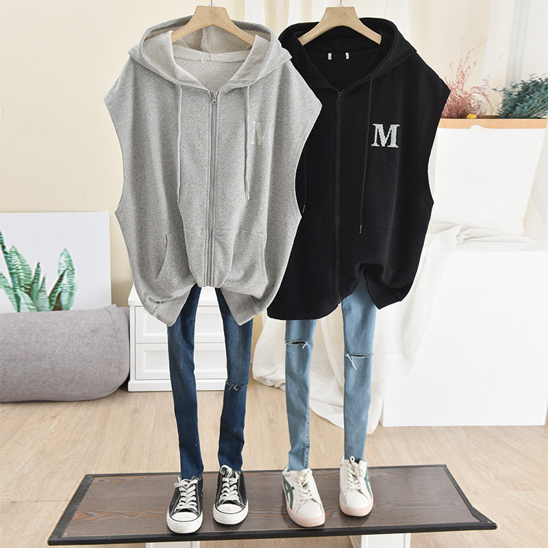 21 Spring and Autumn Thin Korean Edition Loose Size Simple Sleeveless Zipper Cardigan Jacket Ins Hooded Vest Sweatshirt Woman