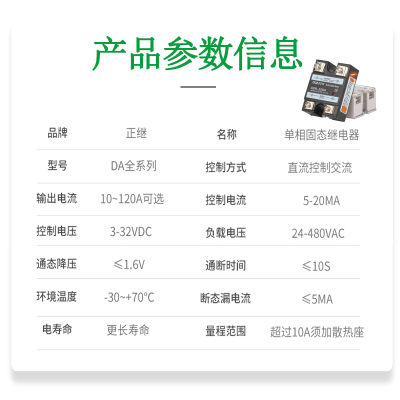DC control AC DA 10A DC control AC DA 25A DC control AC DA 40A DC control AC DA 60A DC control AC DA 80A DC control AC DA 100A DC control AC DA 120A AC control AC control AC AA 10A AC control AC AA 25A AC control AC control AC AA 40A AC control AC AA 60A AC control AC AA 80A AC control AC AA 100A AC control AC AA 120A Single-phase thermal aluminum seat (suitable for 10-25A) Single-phase thermal aluminum seat (suitable for 10-40A) Single-phase thermal aluminum seat (suitable for 40-100A)