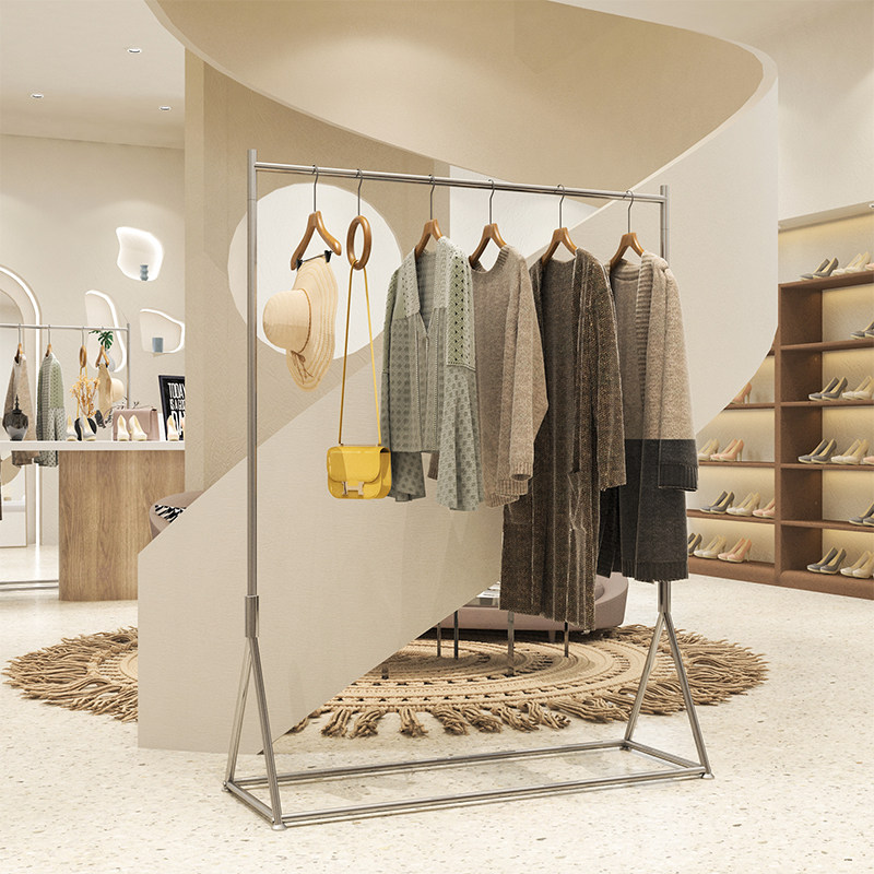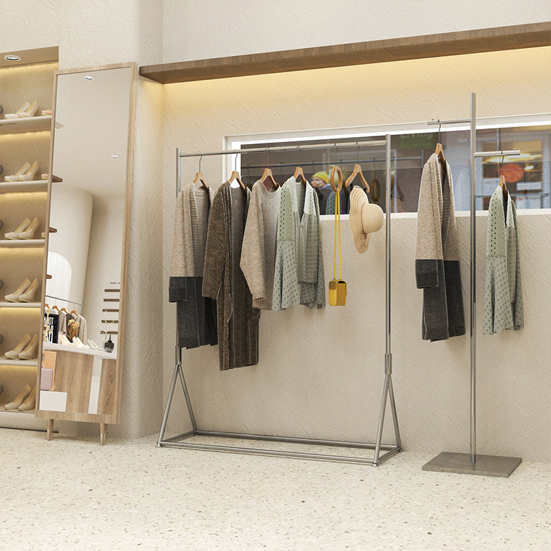 Simple floor rack stainless steel silver brushed side hanging display rack clothing store women's clothing display rack thickened shelf
