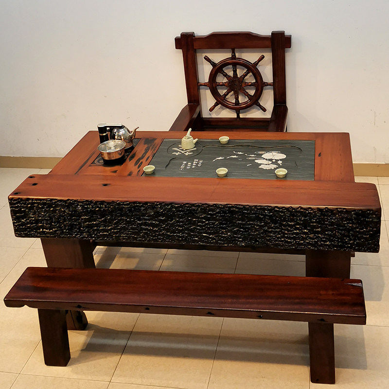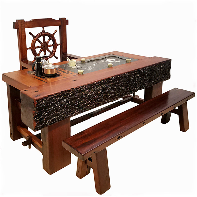 Old ship wood tea table and chair combination new Chinese balcony solid wood old keel ancient shipwreck wood tea table tea set set