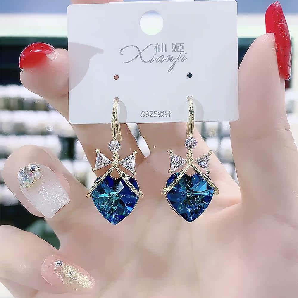 French niche design sense of high-end temperament blue love crystal earrings peach heart-shaped micro-set zircon earrings earrings
