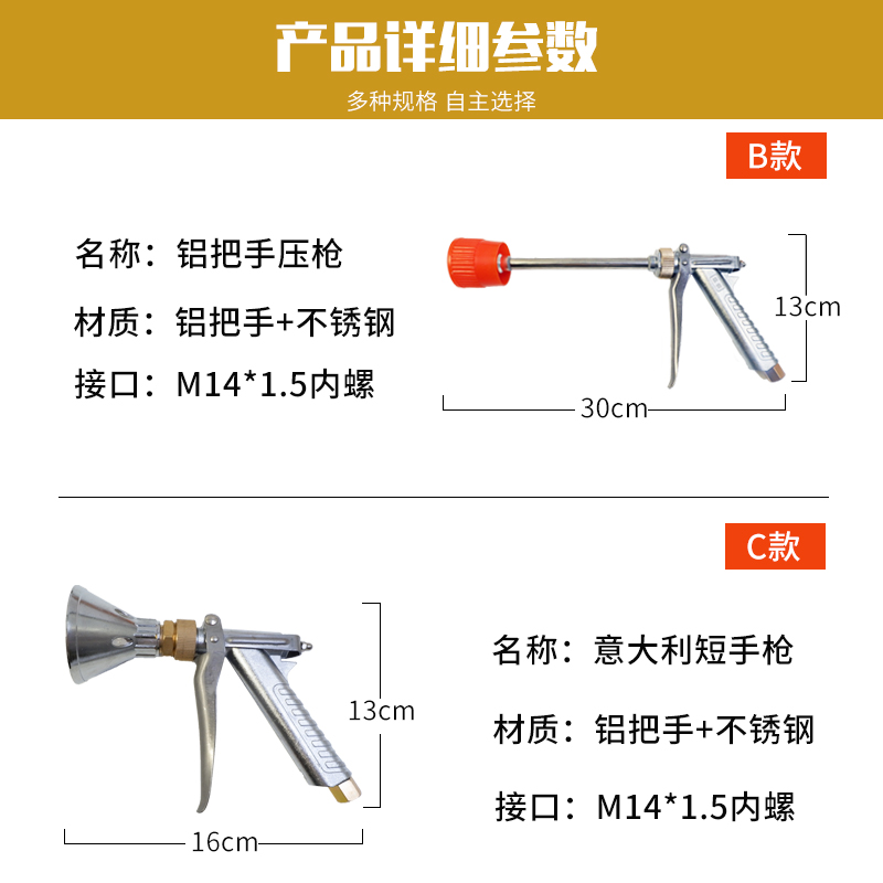 Plastic Handle High Pressure Pistol Aluminum Handle High Pressure Pistol Taiwan With High Pressure Pistol Italian high-pressure gun The following can be matched with a nozzle pistol-type high-pressure spray lever fan-shaped four-head spray rod boutique trumpeter head 4