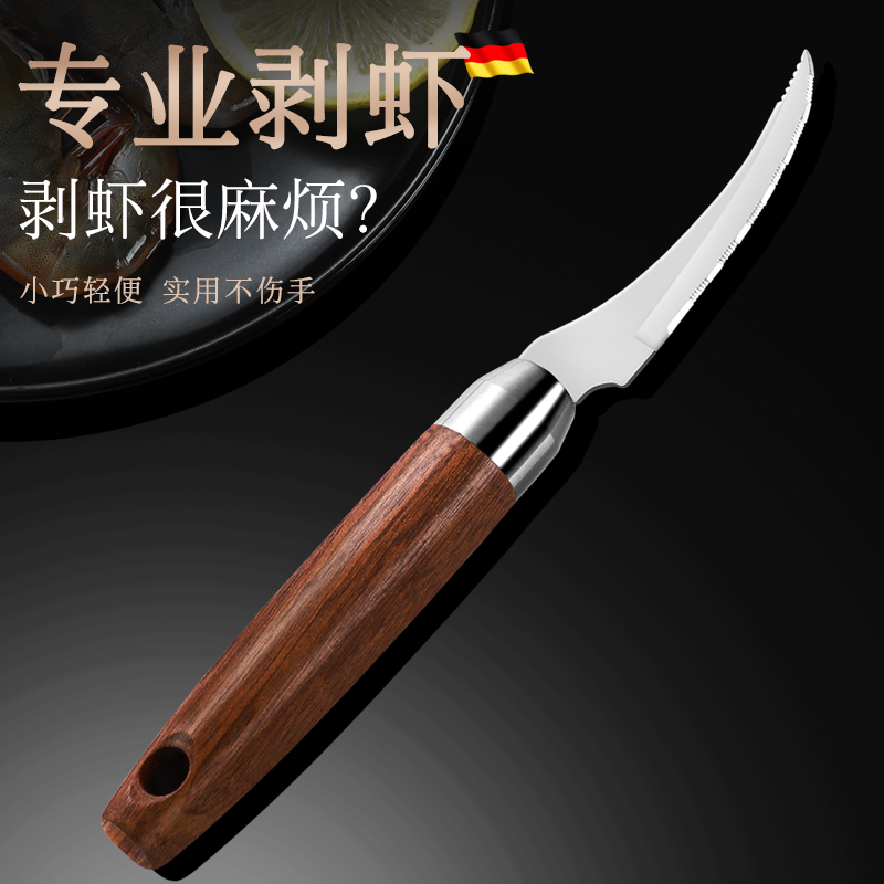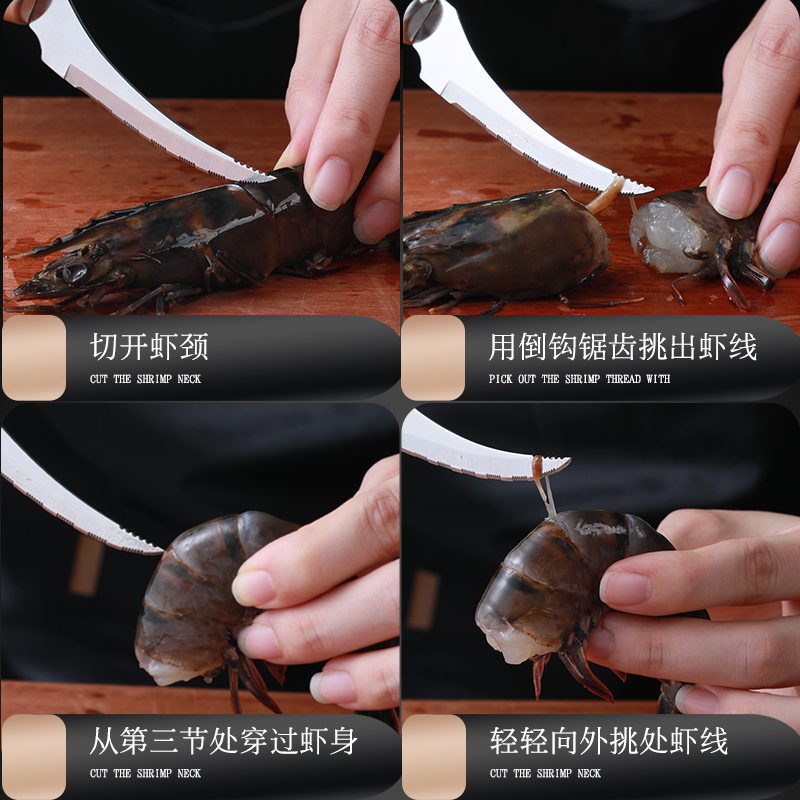 Go to the shrimp line artifact to open the shrimp back to pick the shrimp line knife to open the shrimp back knife to shave the shrimp tool to open the back special side to peel and kill the scissors
