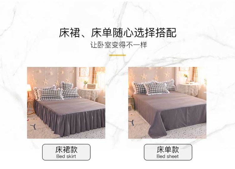 1.2 Bed sheet three-piece set (quilt cover 150x200cm) 1.5 Bed sheet four-piece set (quilt cover 180x220cm) 1.5 Bed sheet four-piece set (quilt cover 200x230cm) 1.8 Bed sheet four-piece set (quilt cover 200x230cm) 2.0 Bed sheet four-piece set (quilt cover 200x230cm) 1.5 Bed skirt four-piece set (quilt cover 200x230cm) 1.8 Bed skirt four-piece set (quilt cover 200x230cm) 2.0 Bed skirt four-piece set ( Duvet cover 200x230cm)